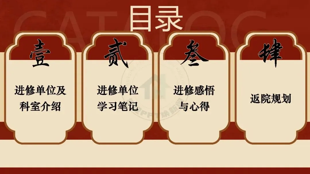 我的汇报分为四个部分:医院介绍、学习笔记、心得体会和返院规划。
