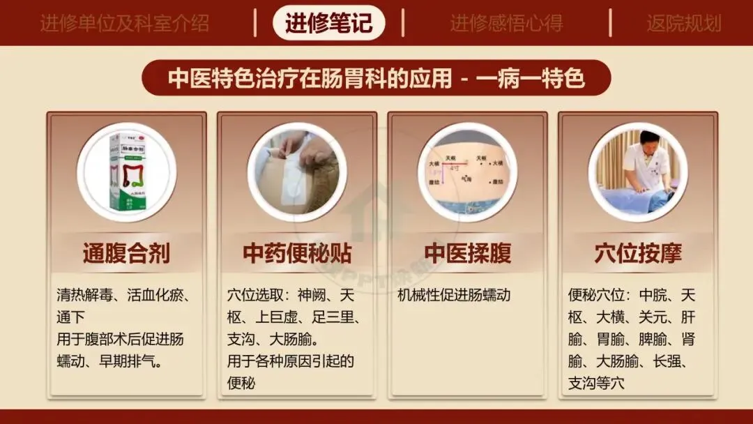 中医特色治疗在肠胃科的应用的一病一特色中,学习了通腹合剂、中药便秘贴、中医揉腹、穴位按摩等在肠胃科的具体应用。