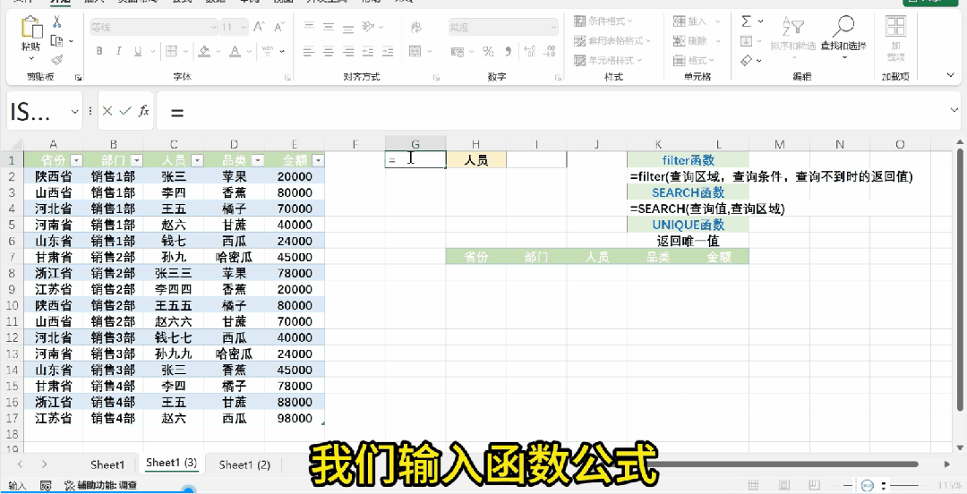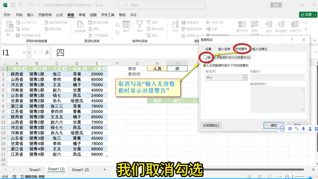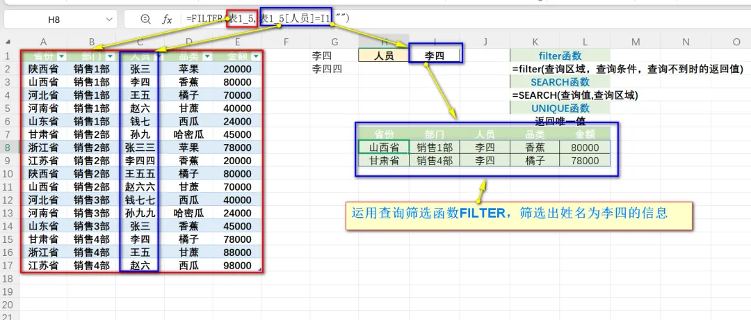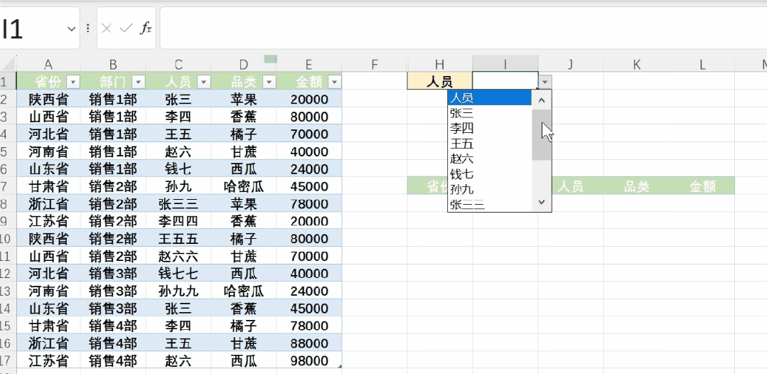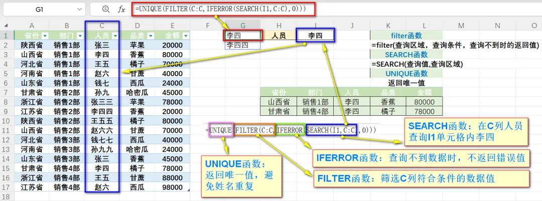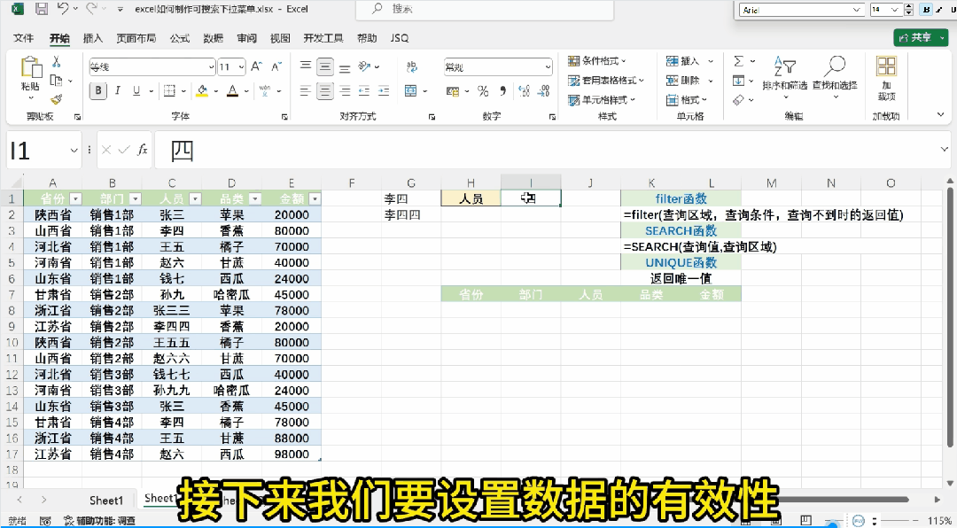 如上图,SEARCH函数:在C列人员查询I1单元格内李四;IFERROR函数:查询不到数据时,不返回错误值;FILTER函数:筛选C列符合条件的数据值;UNIQUE函数:返回唯一值,避免筛选出来的姓名重复。第二步:制作下拉菜单