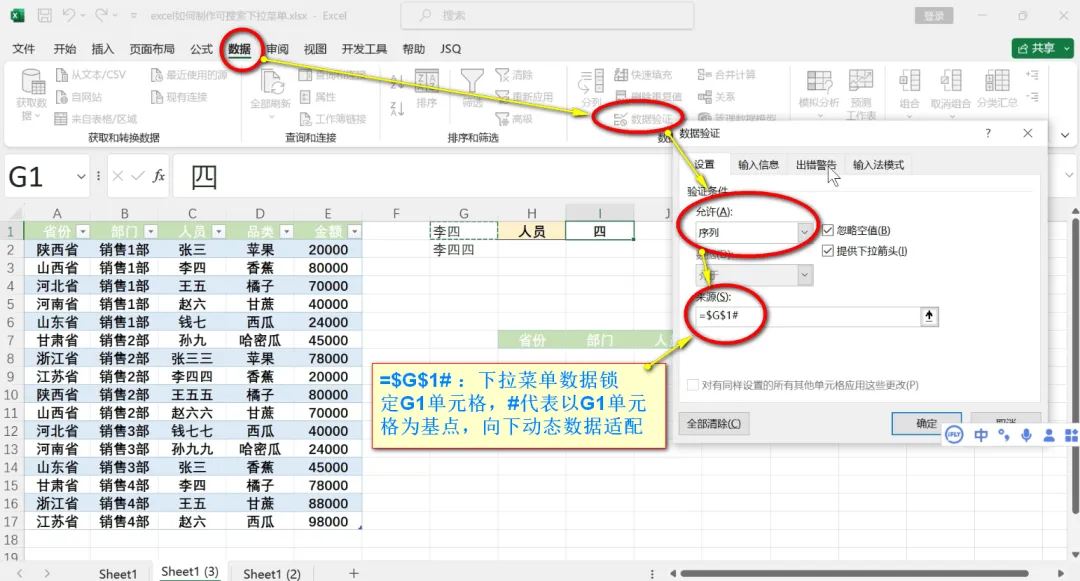 如下图,我们通过数据--数据验证--序列来制作下拉菜单如上图,在数据来源处输入公式=$G$1:下拉菜单数据锁定G1单元格,“#”代表以G1单元格为基点,向下动态数据适配。如上图,在出错警告选项里取消勾选“输入无效数据时显示出错警告”,以便我们在输入无效数据时不弹窗。第三步:制作搜索区域
