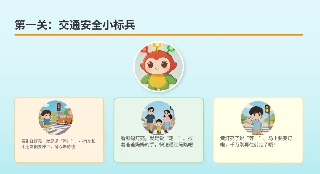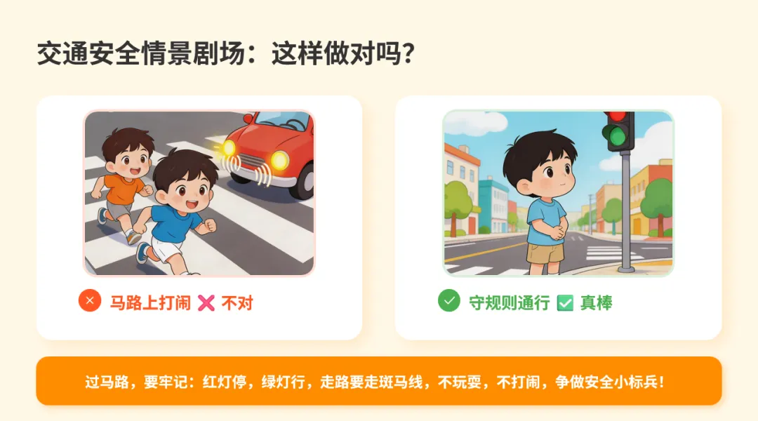 - PPT 展示红绿灯规则:红灯停、绿灯行、黄灯等一等。