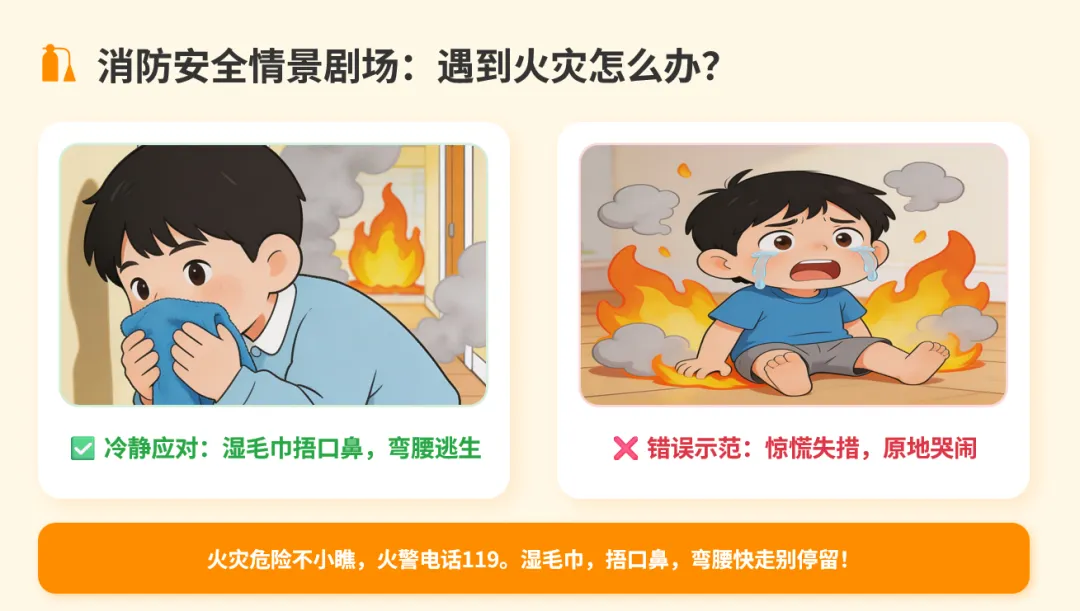 - 逃生方法:湿毛巾捂口鼻、弯腰低头、走楼梯不坐电梯。