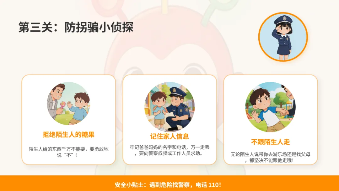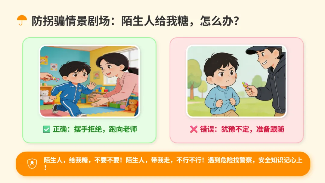 - 情景判断:陌生人给糖→摆手拒绝、找老师 / 警察。