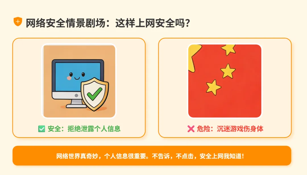 - 难点:在情景中正确选择安全行为,主动拒绝危险、保护自己。