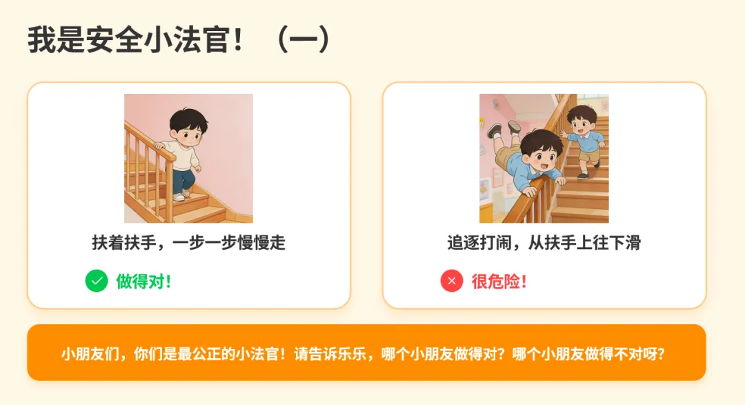 - PPT 出示行为图片,幼儿举 “对 / 错” 卡片判断: