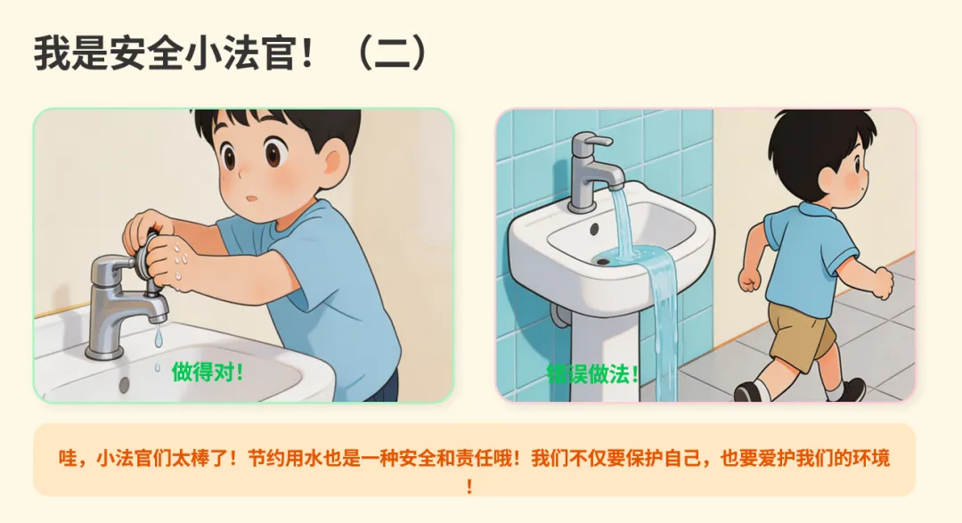 - 教师小结:安全不仅保护自己,也要爱护环境、节约资源。