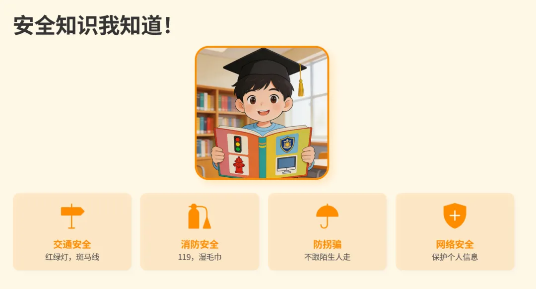 - 认知目标:知道 4 月 15 日是国家安全教育日,了解交通安全、消防安全、防拐骗、网络安全四项基础安全知识。