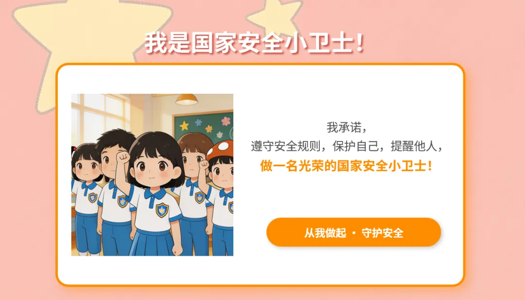 - 安全宣誓:我承诺,遵守安全规则,保护自己,提醒他人,做国家安全小卫士!