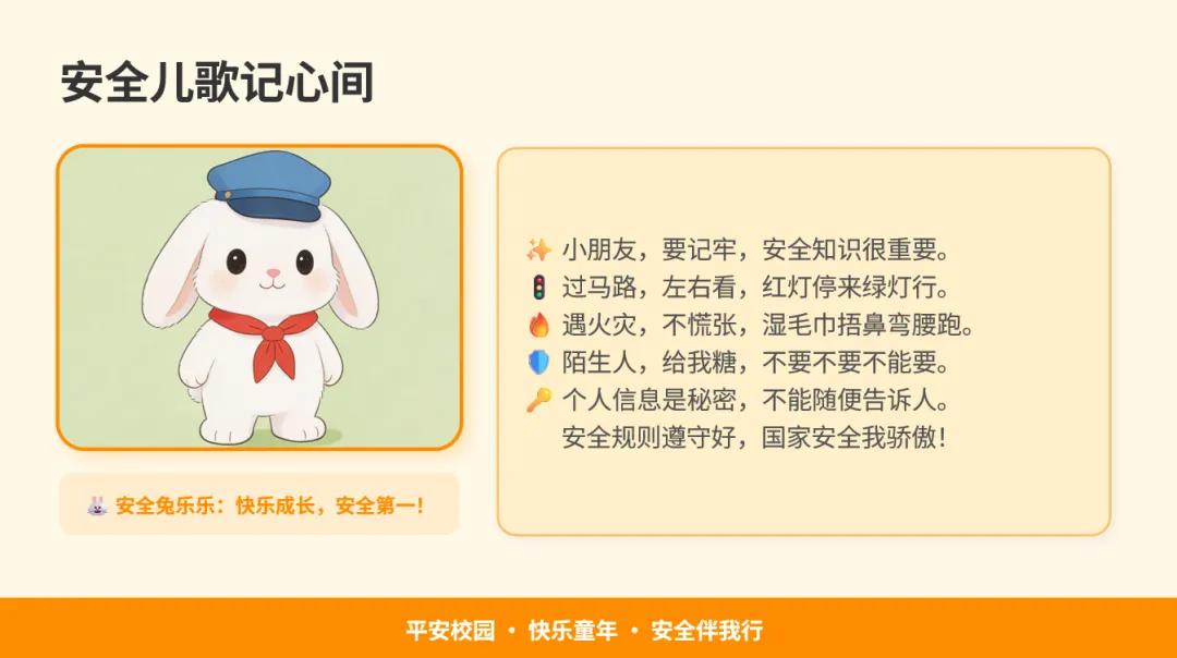 - 活动形式:PPT 互动教学 + 情景判断 + 儿歌学习 + 安全宣誓