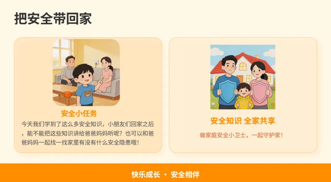 - 发放安全小任务:回家把安全知识讲给爸爸妈妈,一起查找家里安全隐患。