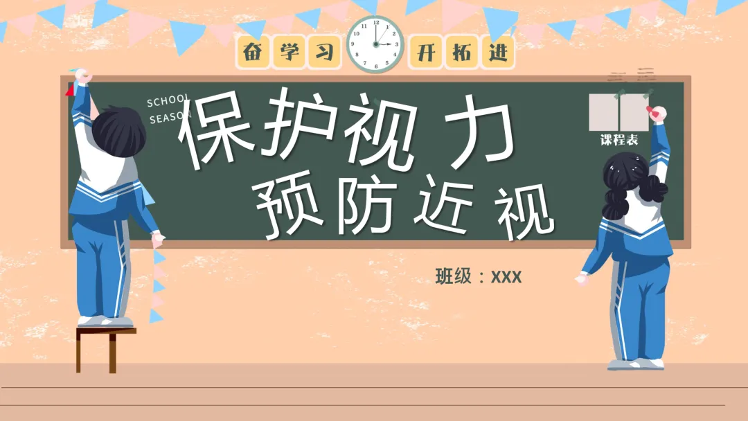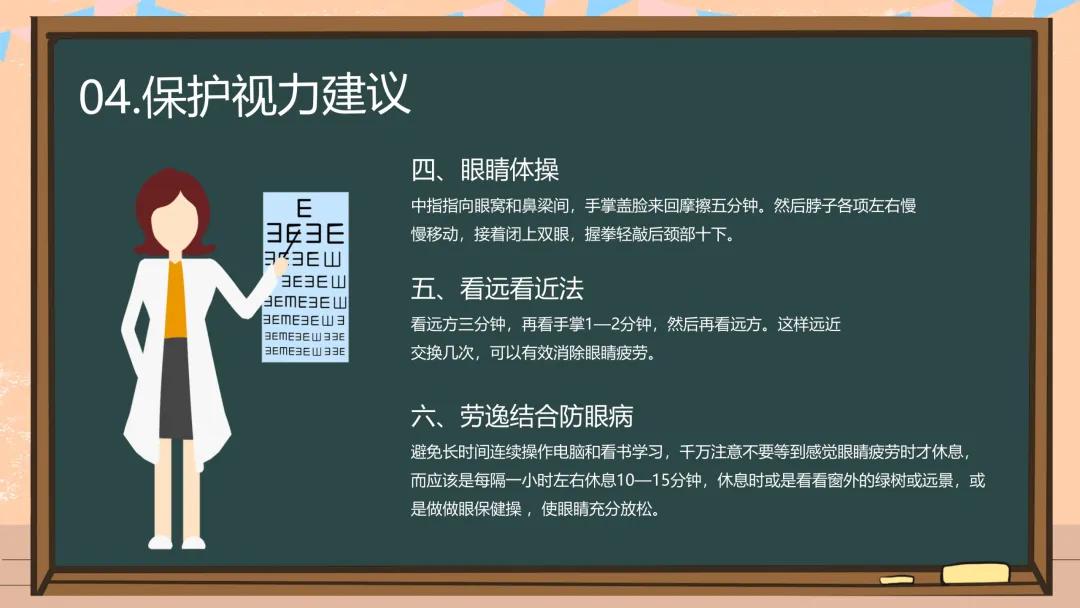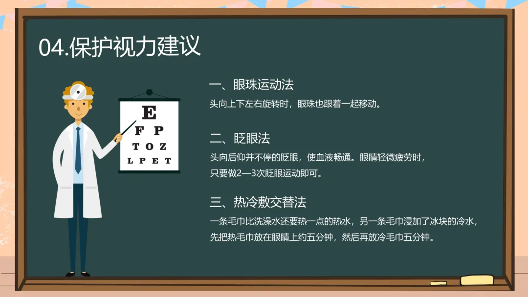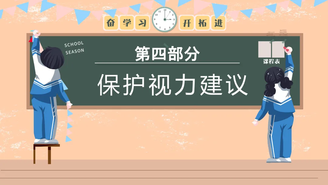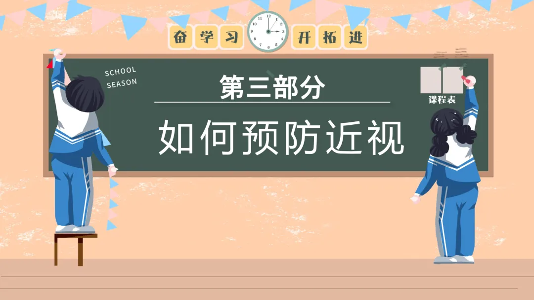 坚持做眼保健操:每天上下午各做一次眼保健操,跟着节奏认真做,能缓解眼睛疲劳,让眼睛放松下来,坚持下去就有效果~