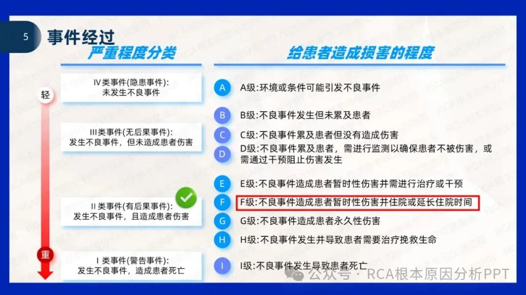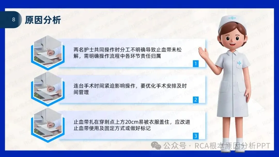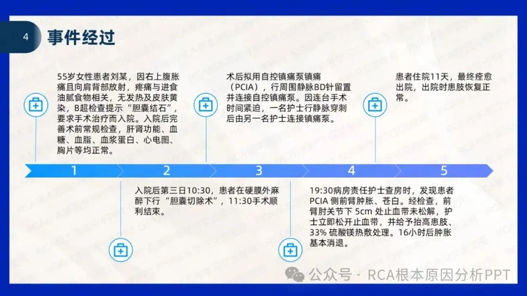 在手术中,因手术涉及多个环节且为连台手术。两名护士共同负责相关操作,其中在静脉穿刺环节使用了止血带,由于操作分工不明确,在完成静脉穿刺后,止血带未及时松解。止血带扎在穿刺点上方 20cm 处,位置较高且被患者衣服盖住,后续操作中未被及时发现。同时,患者使用了 PCIA 进行镇痛,其镇痛作用降低了患者神经敏感性,使得患者未及时察觉肢体异常。直至手术结束,才发现止血带未取下,此时穿刺肢体已出现肿胀。经评估,此次不良事件按照严重程度分级,属于F级事件,对患者造成了一定程度的伤害。