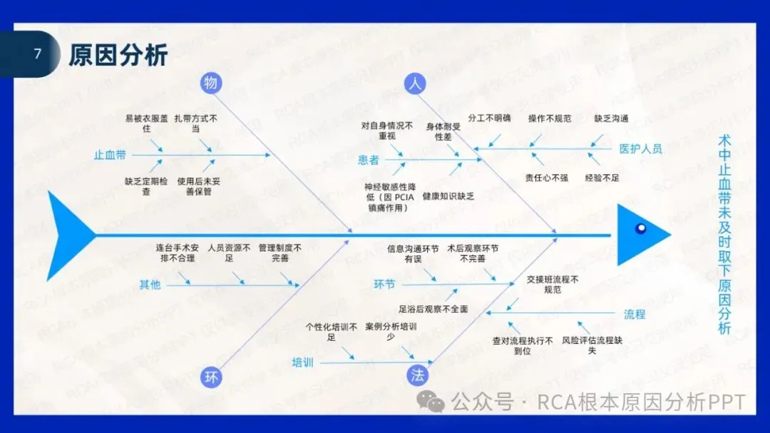 将 “止血带未及时取下” 这一问题置于鱼头位置,从多个维度展开分析。人员方面,两名护士操作分工不明确;设备方面,止血带固定位置易被遮挡;环境方面,连台手术时间紧迫;流程方面,静脉穿刺流程不完善;药物方面,PCIA 影响患者神经敏感性。