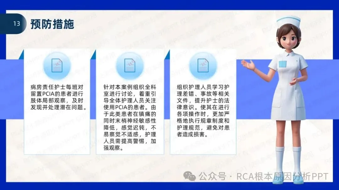 组织全科室围绕本案例展开讨论,着重强调关注使用 PCIA 患者的特殊性;通过学习护理差错、事故相关文件,强化护理人员的法律意识,促使其严格遵循规章制度与护理规范。
