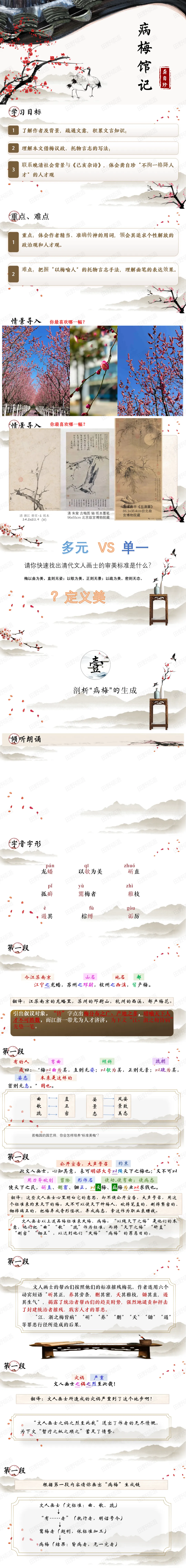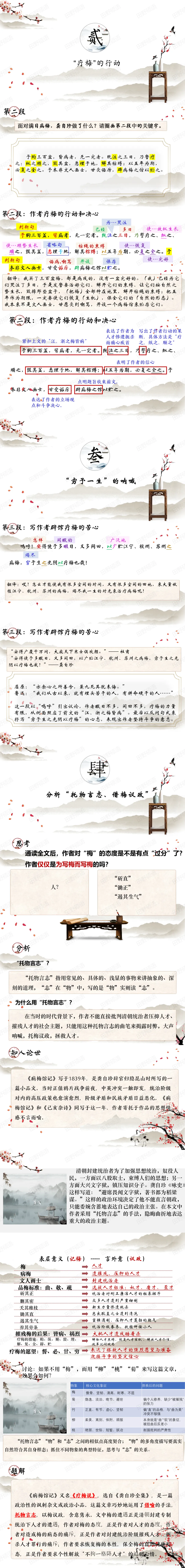 《病梅馆记》是一篇有深刻思想和战斗性的文言文。作者句句写梅,字里行间却是句句写人,有对清朝统治者残害人才的痛恨,有对被戕害人才的痛惜,还有知识分子以天下为己任的担当——穷尽一生岁月以疗梅!这种托物言志的写作手法,寄托了作者复杂的情感,表达着深刻的寓意。