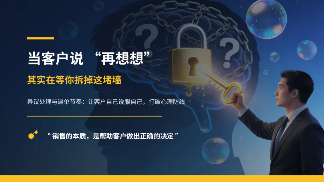 我相信,很多伙伴遇到这些拒绝,要么慌了神,要么硬劝,最后把客户推得越来越远。其实大家有没有想过,客户的每一句拒绝,都不是真的“不想买”,而是在等你帮他拆掉心里的那堵墙——那堵由顾虑、怀疑、犹豫筑成的墙。