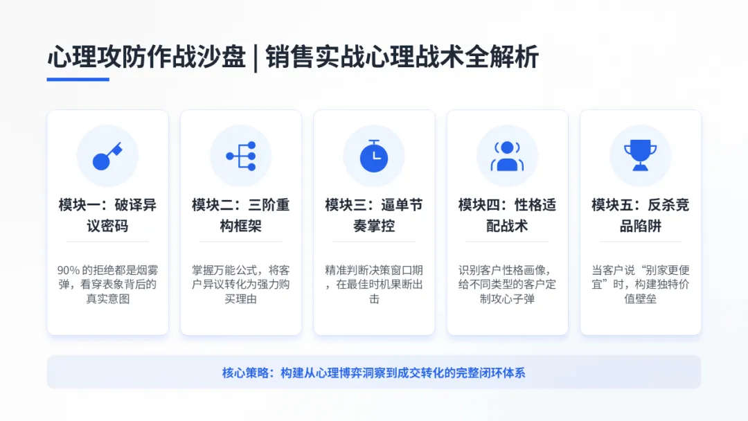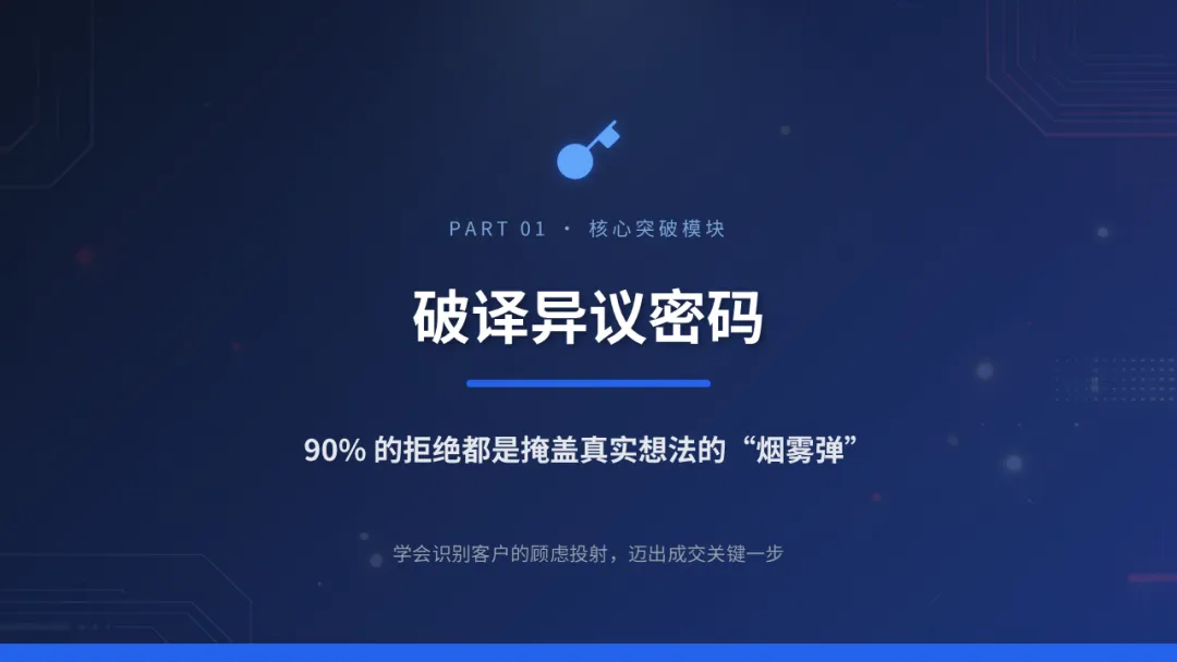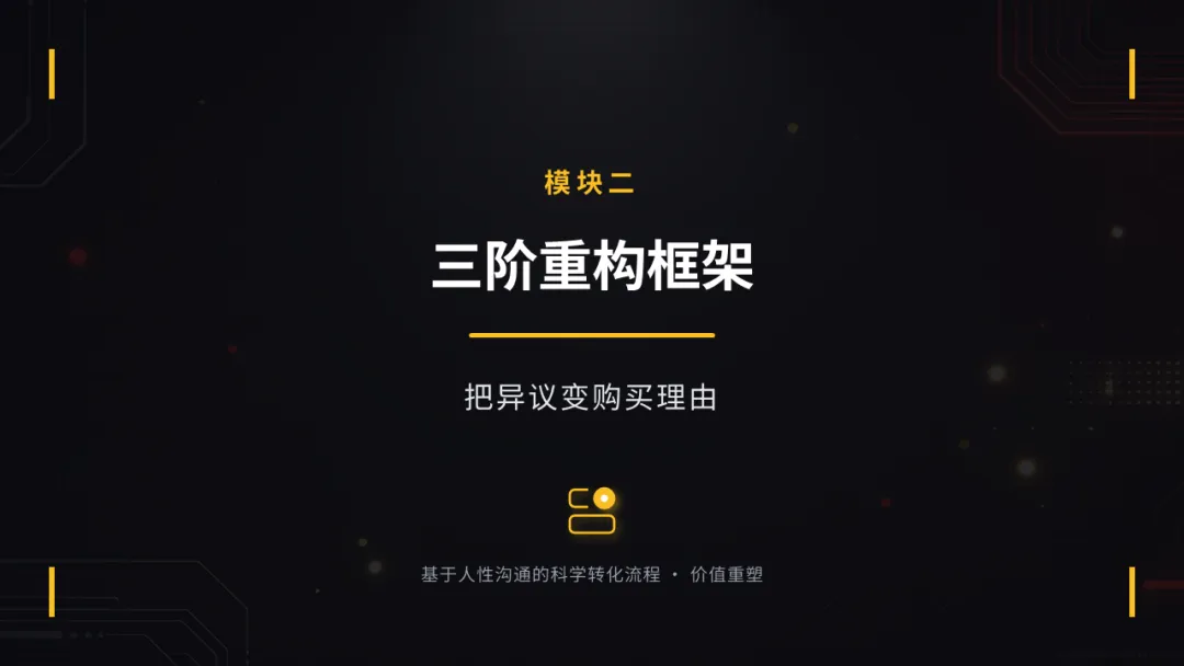 总结一下这一模块的核心:看穿表象话术,直击客户的心理动机,精准匹配应对策略,这是我们成交的第一步,也是最关键的一步。