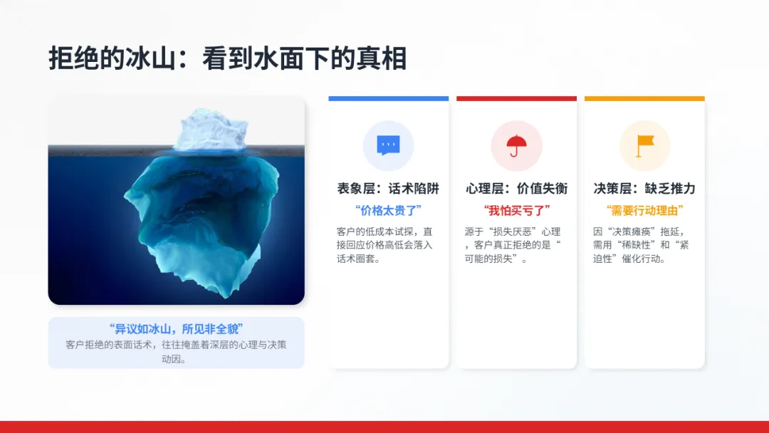 首先我们要明确一个核心认知:90%的客户拒绝,都是掩盖真实想法的“烟雾弹”。就像冰山一样,我们看到的表面话术,只是冰山一角,水面之下,是客户的心理顾虑、价值判断和决策困境——这才是我们真正要解决的问题。