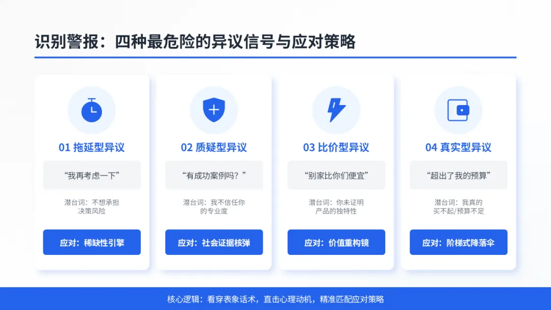 了解了这三个层面,我们再来看四种最危险的异议信号,每种信号都有对应的潜台词和应对策略,大家一定要记牢、会用: