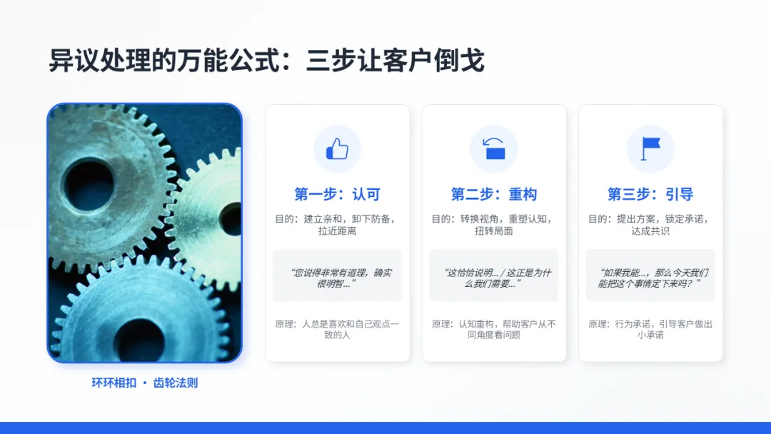 知道了客户异议的真相,接下来我们学习一套万能公式,不管遇到哪种异议,都能套用,三步就让客户“倒戈”,把拒绝变成购买的理由。这套公式的核心,就是“认同→重构→引导”,环环相扣,就像齿轮一样,一步都不能少。