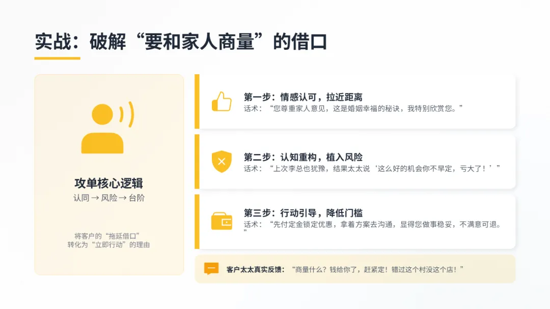 第一个场景,破解“要和家人商量”的借口。很多客户都会用这句话拖延,我们用“认同→风险→台阶”的逻辑,把借口变成行动理由。第一步,情感认可:“您尊重家人意见,这是婚姻幸福的秘诀,我特别欣赏您。”;第二步,认知重构,植入风险:“上次李总也犹豫,结果太太说‘这么好的机会你不早定,亏大了!’”;第三步,行动引导,降低门槛:“先付定金锁定优惠,拿着方案去沟通,显得您做事稳妥,不满意可退。” 大家看,这样一来,客户就没有了拖延的理由,也没有了风险顾虑。