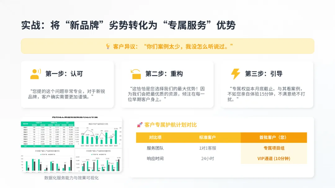 第二个场景,把“新品牌”的劣势,转化为“专属服务”的优势。客户说“你们案例太少,我没怎么听说过”,我们还是用三阶框架。第一步,认可:“您提的这个问题非常专业,对于新锐品牌,客户确实需要更加谨慎。”;第二步,重构:“这恰恰是您选择我们的最大优势!因为我们会把最优质的资源,倾注在每一位早期客户身上。”;第三步,引导:“专属权益本月底截止。与其看案例,不如您亲自体验15分钟,不满意绝不打扰。” 这样一来,劣势就变成了独有的优势,客户的顾虑也变成了购买的动力。
