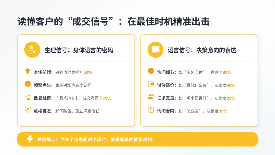 先看生理信号,就是客户的身体语言。第一,身体前倾,这说明客户的兴趣值显著提升了60%,他在认真听你讲,对你的产品感兴趣;第二,频繁点头,这表示他对你的观点高度认同,已经被你说服了一大半;第三,反复触摸产品、资料或者银行卡,这说明他在思考“怎么买”,成交意愿提升70%;第四,放松姿态,比如靠在椅子上、解开衣领,这说明他已经卸下防备,和你建立了深度信任。