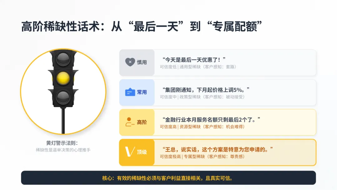 慎用的是“今天是最后一天优惠了!”,通用型稀缺,客户感知就是套路,可信度低;常用的是“集团刚通知,下月起价格上调5%”,政策型稀缺,可信度中等,客户会觉得是被动接受,不是你故意套路他;高阶的是“金融行业本月服务名额只剩最后2个了”,资源型稀缺,可信度高,客户会觉得机会难得,不买就错过了;顶级的是“王总,说实话,这个方案是特意为您申请的”,专属型稀缺,可信度极高,能给客户尊贵感,让他觉得自己被重视,成交意愿会大幅提升。