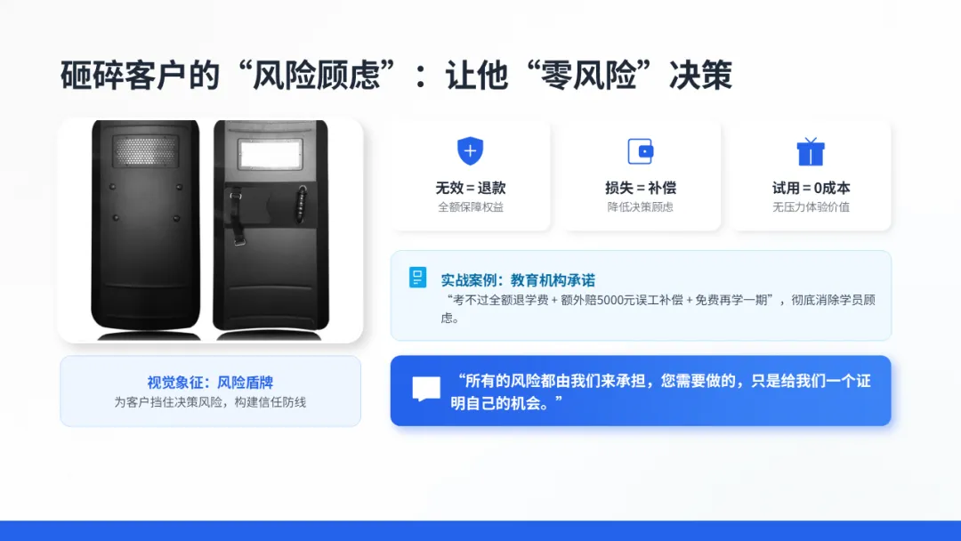 给大家一个实战案例,教育机构的承诺:“考不过全额退学费 + 额外赔5000元误工补偿 + 免费再学一期”,这样的承诺,彻底消除了学员的顾虑,成交率大幅提升。我们可以借鉴这个逻辑,给客户足够的保障,告诉他:“所有的风险都由我们来承担,您需要做的,只是给我们一个证明自己的机会。”