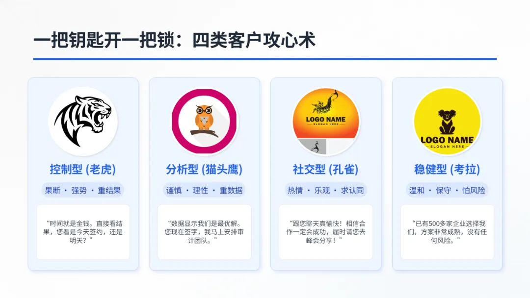 第四类,稳健型(考拉)。这类客户的特点是温和、保守、怕风险,不喜欢冒险,更愿意相信成熟、靠谱的选择。和他们沟通,要多讲案例、多给保障,消除他的风险顾虑。话术可以是:“已有500多家和您一样的企业选择我们,方案非常成熟,没有任何风险,而且我们有完善的售后保障,您完全不用担心。” 重点是让他觉得“安全、靠谱”,降低他的决策压力。