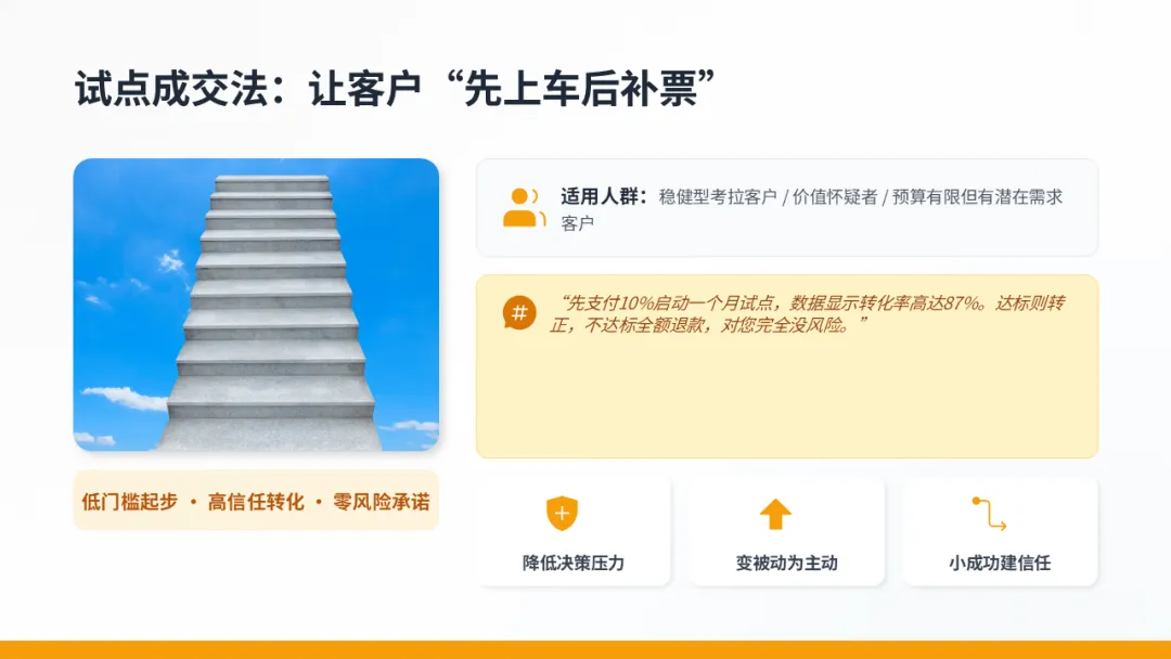 这里给大家一个特别实用的方法——试点成交法,适合稳健型考拉客户、价值怀疑者,以及预算有限但有潜在需求的客户。核心逻辑是“低门槛起步、高信任转化、零风险承诺”。话术可以是:“先支付10%启动一个月试点,我们的数据显示,试点客户的转化率高达87%。如果达标,我们就正式合作;如果不达标,全额退款,对您完全没有风险。” 这样做,既能降低客户的决策压力,又能通过小成功建立信任,变被动跟进为主动成交。