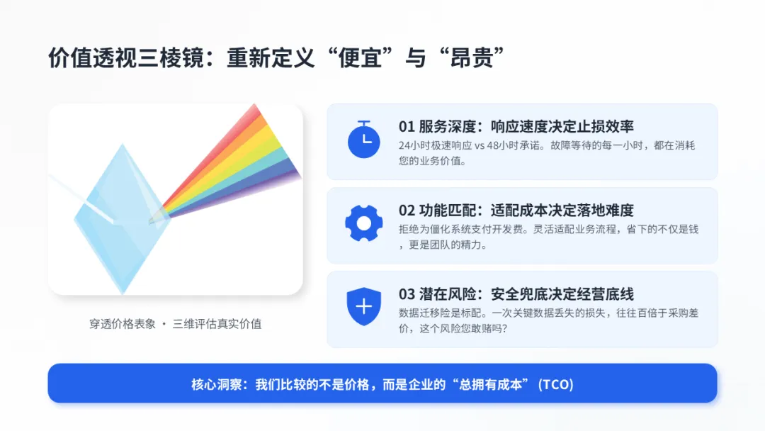 第三个维度,潜在风险。这是最关键的一点,很多客户只看表面价格,忽略了背后的风险。我们可以说:“数据迁移险是我们的标配,而别家可能没有。一次关键数据丢失的损失,往往百倍于我们之间的采购差价,这个风险,您敢赌吗?我们的产品能给您的业务兜底,这才是最核心的价值。” 重点是让客户看到,我们能帮他规避风险,这是便宜的产品无法替代的。