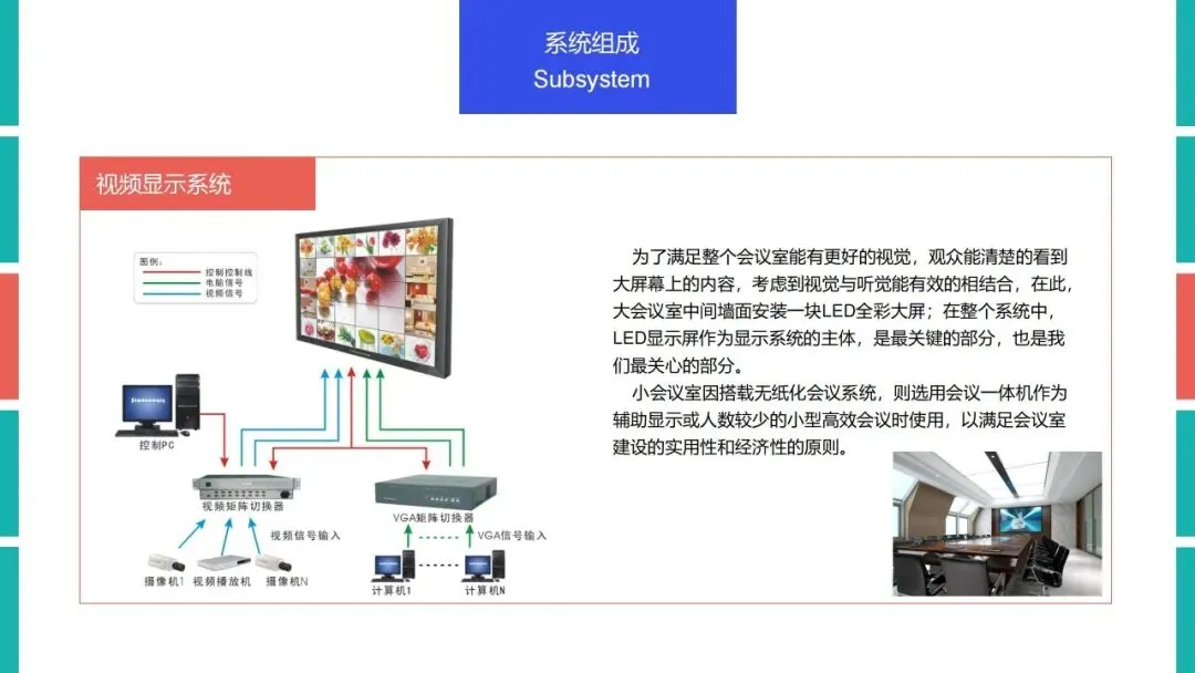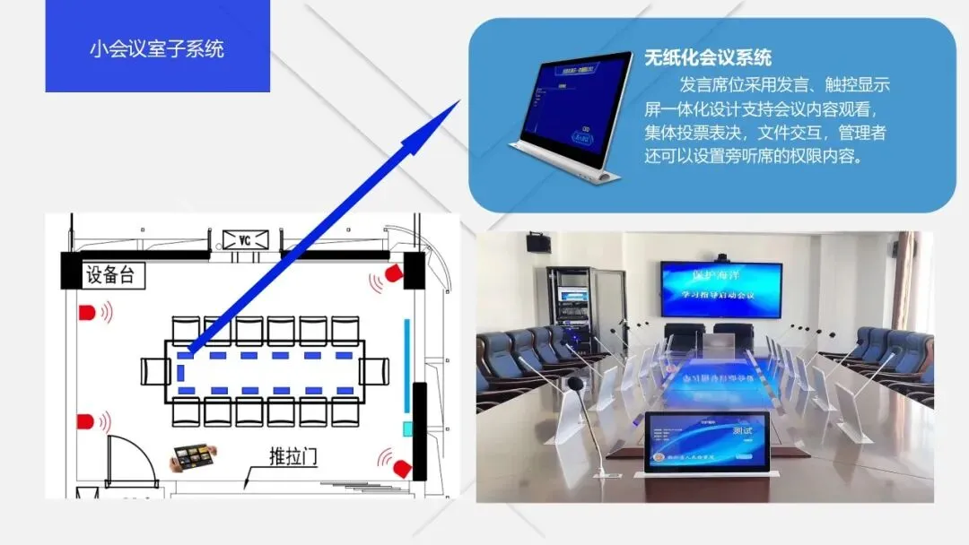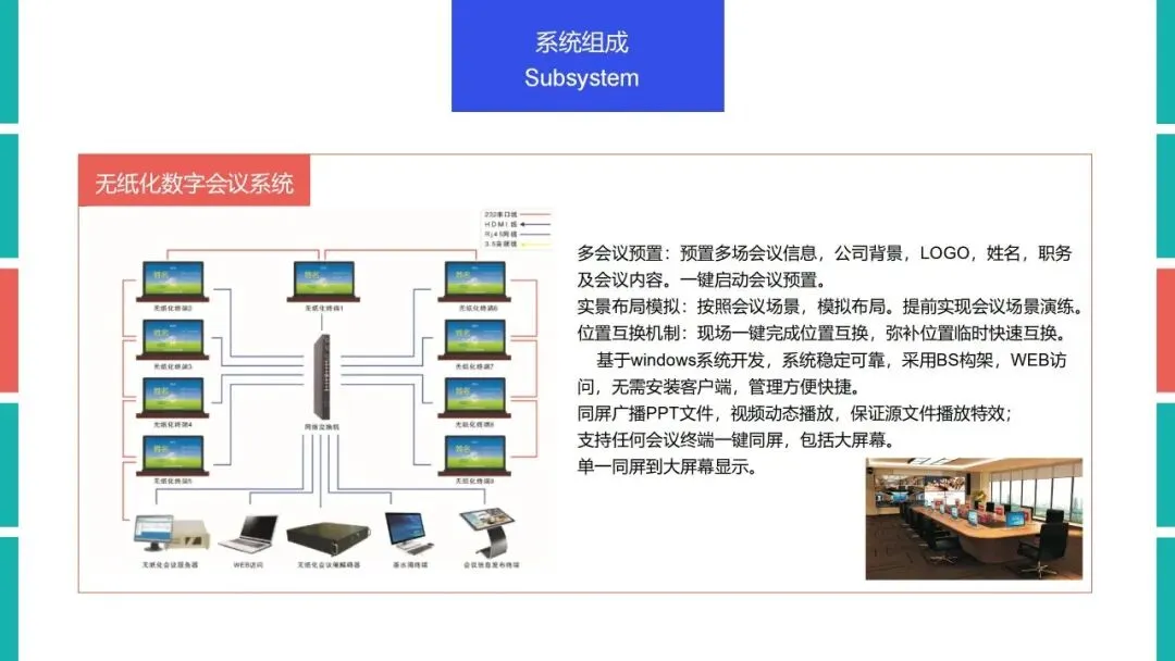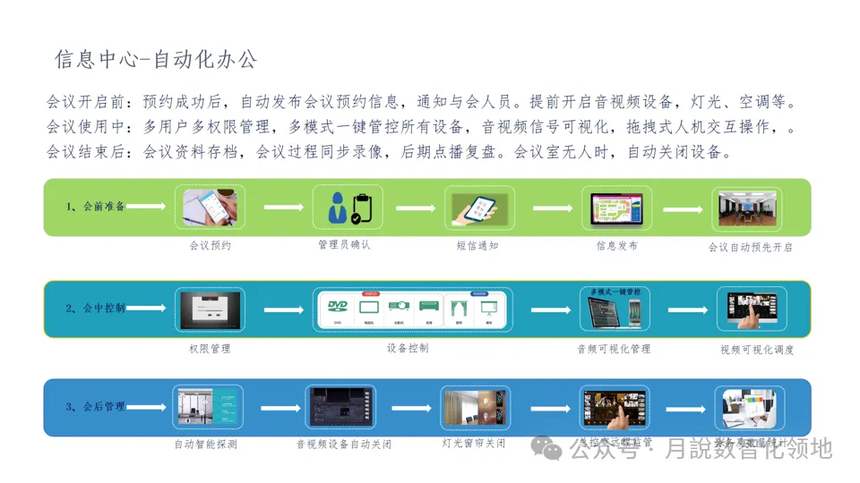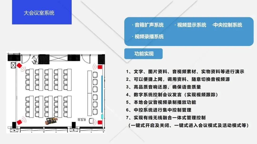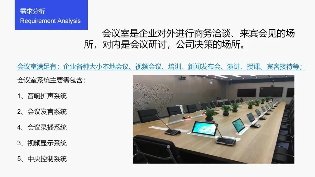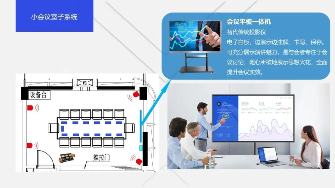 其次是数字化会议室,它是智慧会议室的基础形态,指集成现代信息技术和人工智能,具备数字化设备、数字化管理、智能化会议流程及安全保障的会议室,通常配备智能显示、音视频、网络等设备,可实现信息共享、远程协作等基础功能。