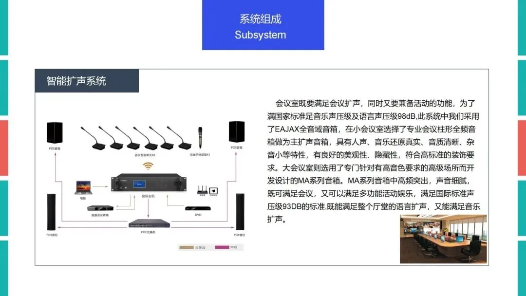 智慧会议室则是数字化会议室的高级阶段,是在数字化基础上,融合人工智能、物联网、5G、VR/AR、数字孪生等前沿技术,构建的全流程、沉浸式、高效协同的智能办公空间。它区别于传统会议室的“工具集合”和数字化会议室的“功能集成”,核心在于实现“主动服务、智能演进”,可根据会议需求自动调节环境、优化流程、辅助决策,形成完整的智慧会议生态。