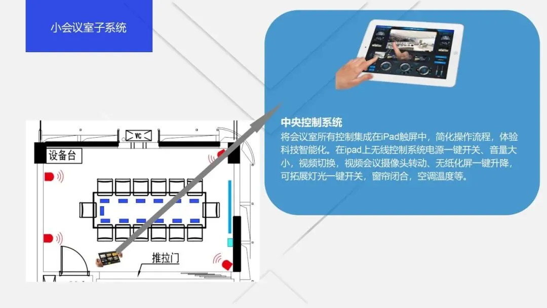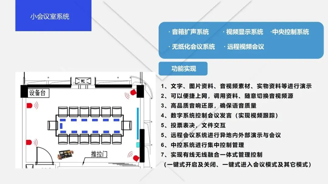 从核心特征来看,智慧会议室具备四大显著特点:一是全流程智能化,覆盖会议预约、签到、开展、纪要生成、散会归档等全环节,无需人工过多干预,例如通过人脸识别实现无感签到,通过AI技术自动生成会议纪要;二是沉浸式协同,借助高清音视频、VR/AR等技术,打破空间壁垒,让远程参会者获得接近面对面的沟通体验,实现跨地域多会议室的同步协作;三是环境自适应,通过物联网传感器实时采集光照、温湿度、人员数量等数据,自动调节灯光、空调、窗帘等设备,兼顾舒适度与节能需求;四是安全合规化,具备全方位的物理安全和信息安全保障体系,实现会议内容加密传输、设备状态实时监控、异常情况及时预警,契合数据安全法、个人信息保护法的相关要求。