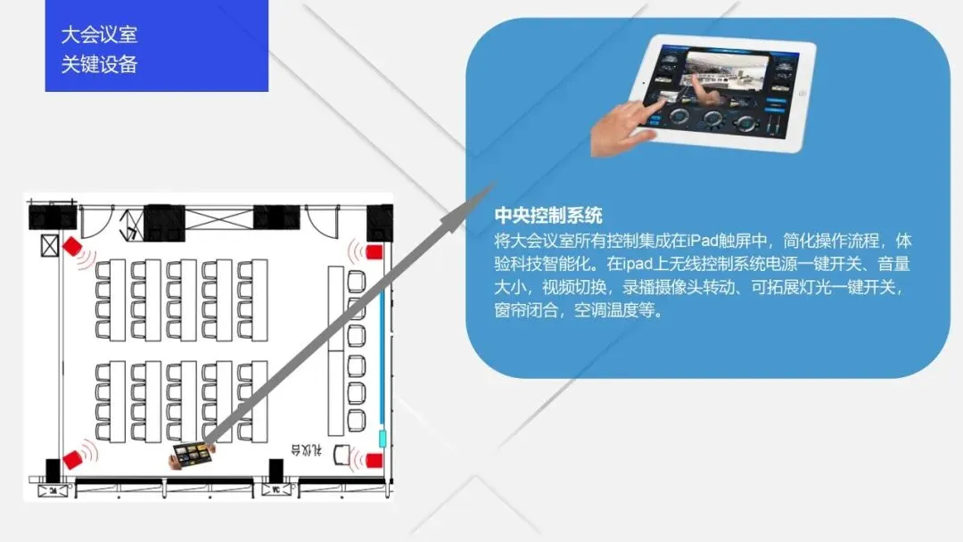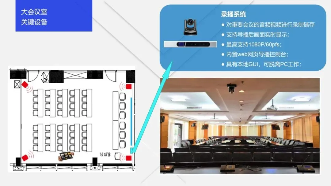 从核心构成来看,智慧会议室主要包括三大模块:一是基础设施层,涵盖智慧音视频设备(数字音频处理器、高清摄像头、全向麦克风等)、智能控制设备(智能中控平台、传感器等)、网络设备,以及具备嵌入式接口的智慧桌椅、无纸化办公设备等,是智慧会议室的硬件基础;二是技术支撑层,包括人工智能(语音识别、人脸识别、发言人追踪等)、物联网、云计算、5G、数字孪生等技术,为智能化功能提供核心支撑;三是应用服务层,涵盖会议预约管理、内容共享、纪要生成、设备运维、数据统计等功能,实现会议全流程的高效管控与便捷应用。