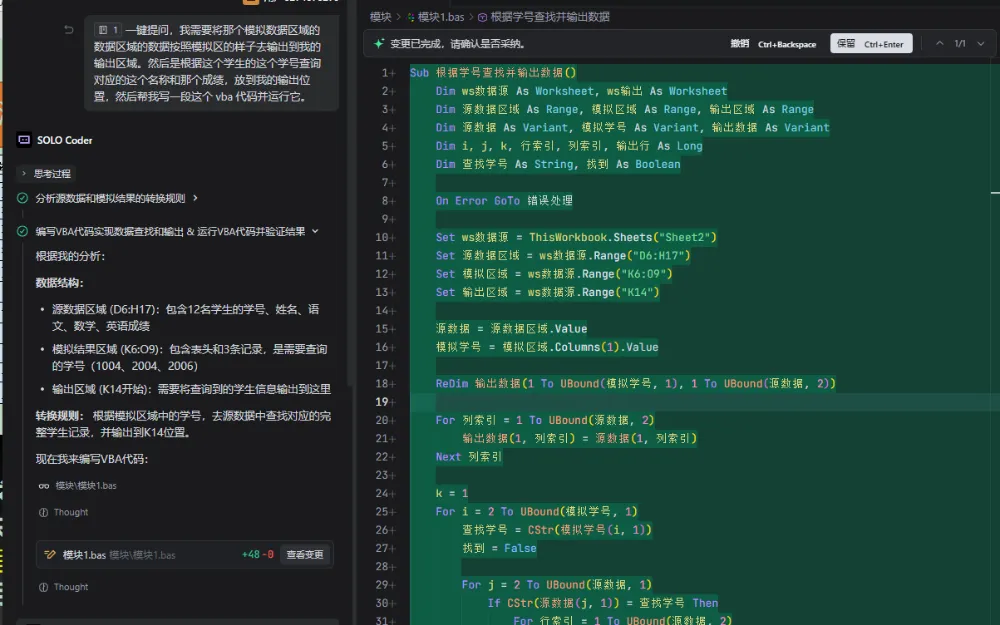 凌晨两点,我把Excel甩给AI:“半小时,我要这张表里所有人的学号和成绩。”办公室只剩屏幕微光,空调早已停摆。市场部那帮人临下班才拍过来的学生数据,明天一早就要对。李助理在旁边小声嘀咕:“王总,这得写VBA吧?匹配学号、拉成绩、再输出……没半小时搞不定啊。”我没说话。半小时?那是三年前的我。上周技术峰会摸到的那个“玩意儿”,该拉出来见见真章了。我点开VB编辑器,找到一个叫【vbaYYDS】的按钮。不是什么新软件,就像给Excel插了副AI耳朵。李助理凑过来,眼神里写着“您又开始研究什么黑科技”。“听着:我有一张学生成绩表。数据区在这儿,模拟区在这儿,输出区我划好了。现在,按模拟区的样子,把数据区里每个学号对应的姓名和成绩,给我搬到输出区。写段VBA,然后直接运行。”对话框里,我的语音指令瞬间被转化成一行行清晰的文字需求。紧接着——“正在解析表格结构……”“识别到数据区范围:A2:C1001”“理解查询逻辑:以学号为键,匹配姓名与成绩……”“开始生成VBA代码……”代码编辑区,光标像被一只无形的手操纵,噼里啪啦地跳动。For循环、Range对象、字典查找……一行接一行,严丝合缝地自动生成。我没空回答。因为就在我们愣神的十几秒里,四十多行结构清晰、注释完整的VBA代码,已经铺满了屏幕。最后一行代码落定,光标跳回顶端。运行按钮自动被“按下”。屏幕闪烁了一下。我们划定的那片“输出区域”,像被施了魔法——学号、姓名、成绩,工工整整,分毫不差地填满了。和李助理手工模拟的“标准答案”,一模一样。办公室里安静得能听见机箱风扇声。李助理猛地转头看我,那眼神我熟——去年签下那个千万单子时,他眼里就是这种光。我关掉Excel,屏幕暗下,映出一点难以察觉的笑。把U盘抛给他:“备份,发我邮箱。明天上午,我要看到市场部所有历史数据的交叉分析报告。”“用我刚用的方法。”我拿起外套,“把你要的‘样子’在表上画出来,然后,告诉它你要什么。”“记住,以后你的时间,不是用来写代码的。”“是用来思考,然后下达命令的。”后记:那个深夜,我测试的不只是一个工具,是一种可能。当AI能听懂“按这个样子,把那里的东西搬过来”这种最直白的指令,并精准转化为可执行的代码时,很多事就变了。【vbaYYDS语音编程】,它解决的从来不只是“写代码快一点”。它解决的是: ✅思维到结果的超短路径:你的逻辑描述,就是最终程序。 ✅零门槛的自动化:不必纠结语法,会说需求就会“开发”。 ✅解放核心生产力:让你聚焦于“要什么”,而非“怎么实现”。那个凌晨加班的年轻经理,或许还在为一段查询代码绞尽脑汁。但坐在屏幕前的你,已经可以换个活法了。千万别再学复杂的函数和vba编程了,只需要思考,然后说出来。剩下的,交给AI。(职场效率变革,往往始于一个“如果不用自己写代码”的念头。)
