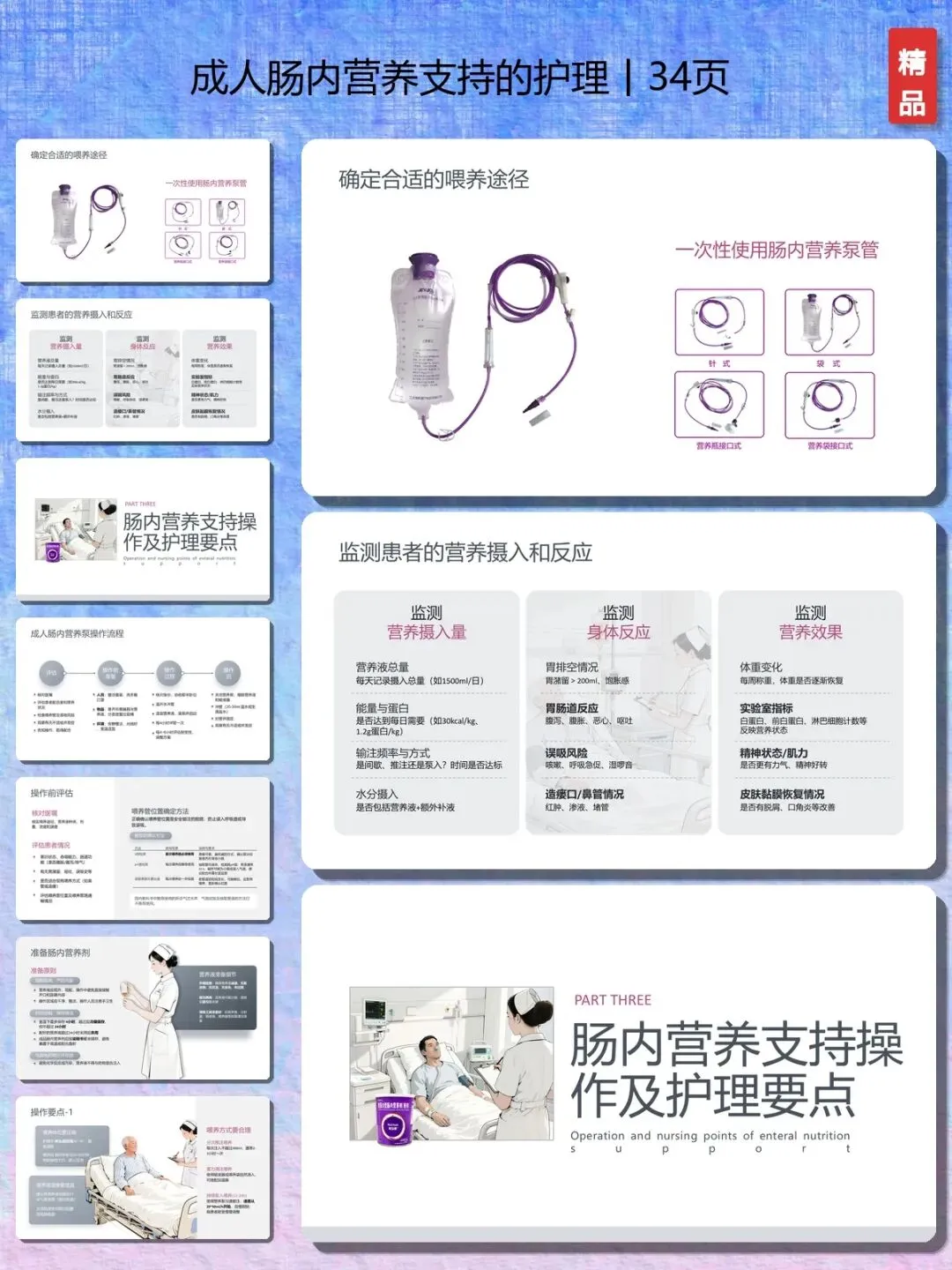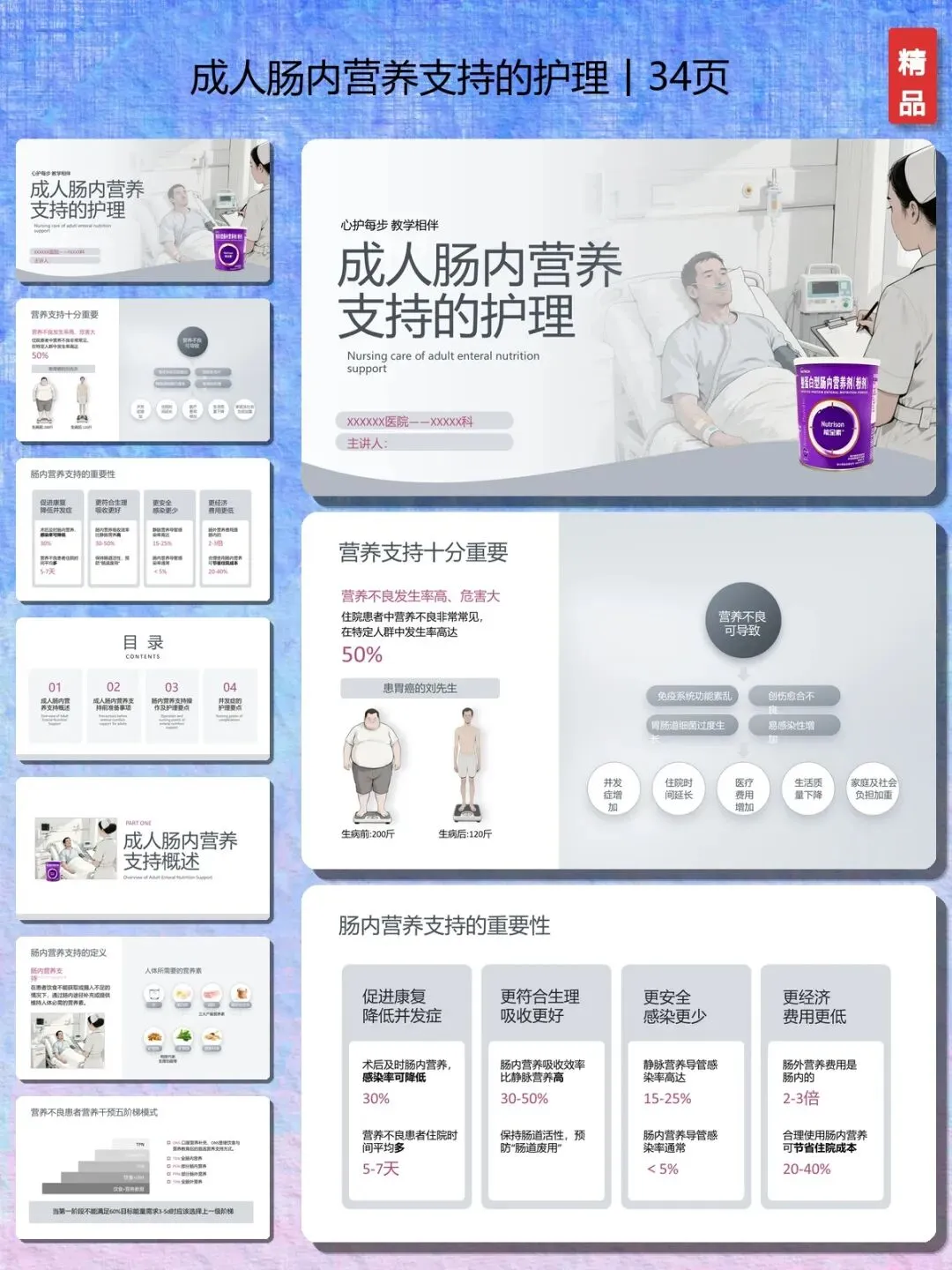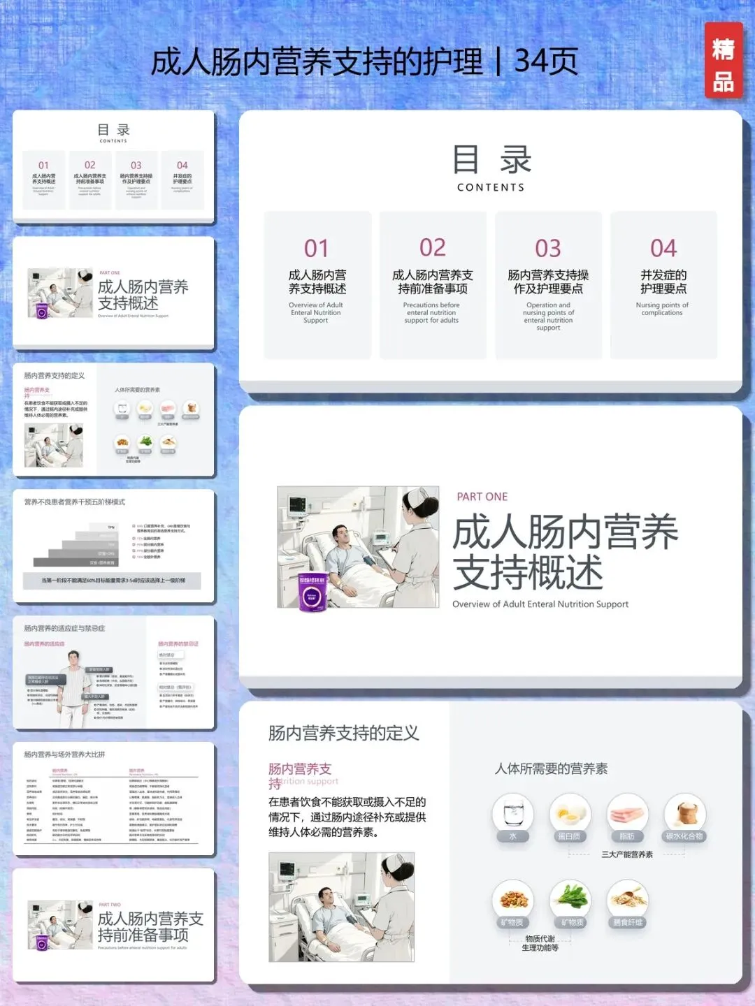 🍎内容:成人肠内营养支持的护理-医护PPT模版📅页数:共34页,无水印可二次编辑🌲目录:01 成人肠内营养支持概述02 成人肠内营养支持前准备事项03 肠内营养支持操作及护理要点04 并发症的护理要点