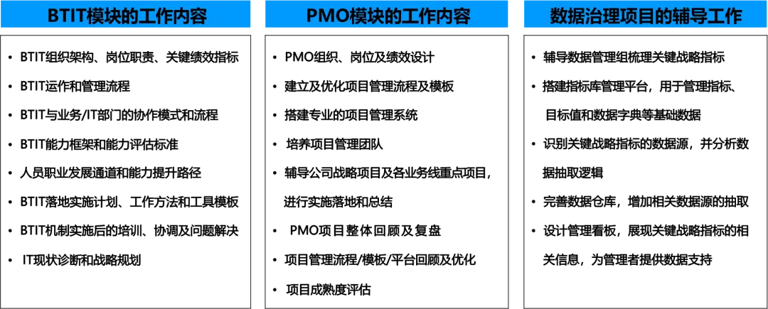 这三个模块协同工作:BTIT确保产生的业务需求是合理且可实现的;PMO确保这些需求能以项目形式被规范地管理和交付;而数据治理则确保项目成果(系统)产生的数据以及公司运营数据能够被有效管理,并反哺业务决策和战略调整。