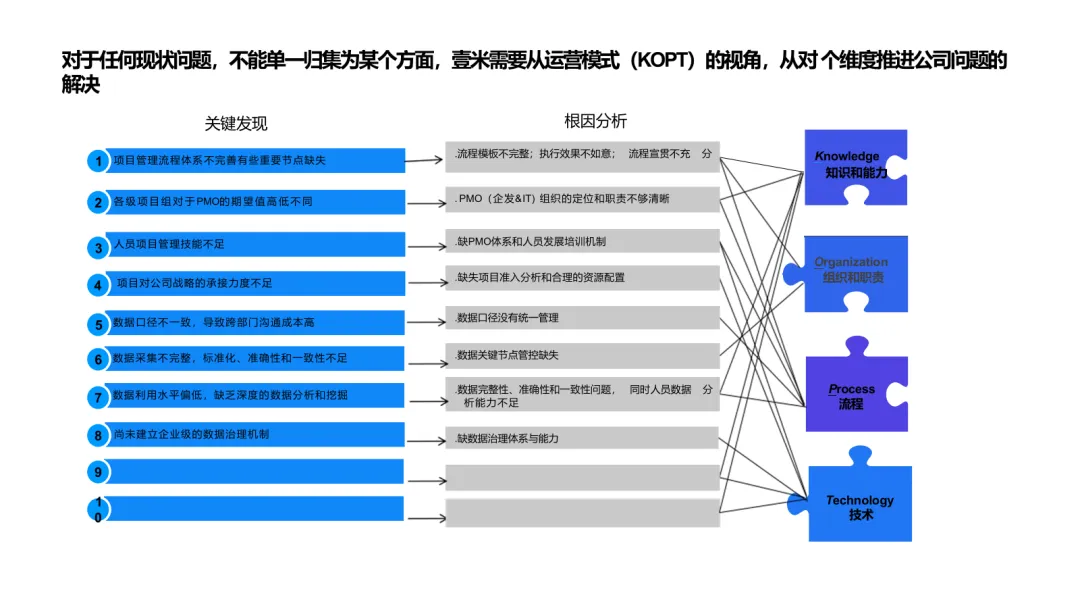 PMO (Project Management Office):核心是强化战略承接与项目规范化管理。通过建立公司级和IT部门级的两层PMO体系,完善从项目准入、分级、执行到复盘的全生命周期管理流程,确保资源投入与公司战略对齐,提升项目成功率和价值。