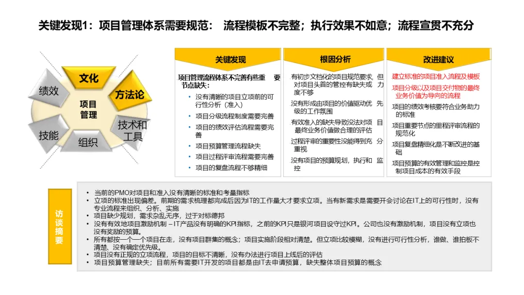 规范化体系:为两层PMO设计统一的、细化的项目管理流程,覆盖项目准入与分级、立项、预算管理、范围管理、干系人沟通、风险管理、变更管理、复盘等十大知识领域。同时,推动项目管理平台(如PPM工具)的建设,实现项目资源、进度和文档的透明化管理。