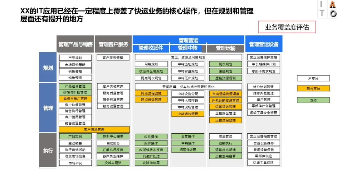 本方案是IBM为某快运公司制定的管理与IT体系顶层规划。其核心目标是解决公司在快速发展中暴露出的三大核心痛点:业务与IT脱节、项目管理粗放、数据治理缺失。为此,项目提出了一个三位一体的综合解决方案,旨在建立“BTIT业务-IT融合机制”、“强化PMO战略项目管理”和“完善数据治理体系”,以支撑公司的战略落地和精细化运营。