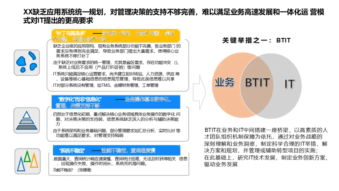 针对现状中“需求管理混乱、临时需求多、解决方案交付质量不稳定”等问题,BTIT方案旨在实现业务与IT的深度融合。