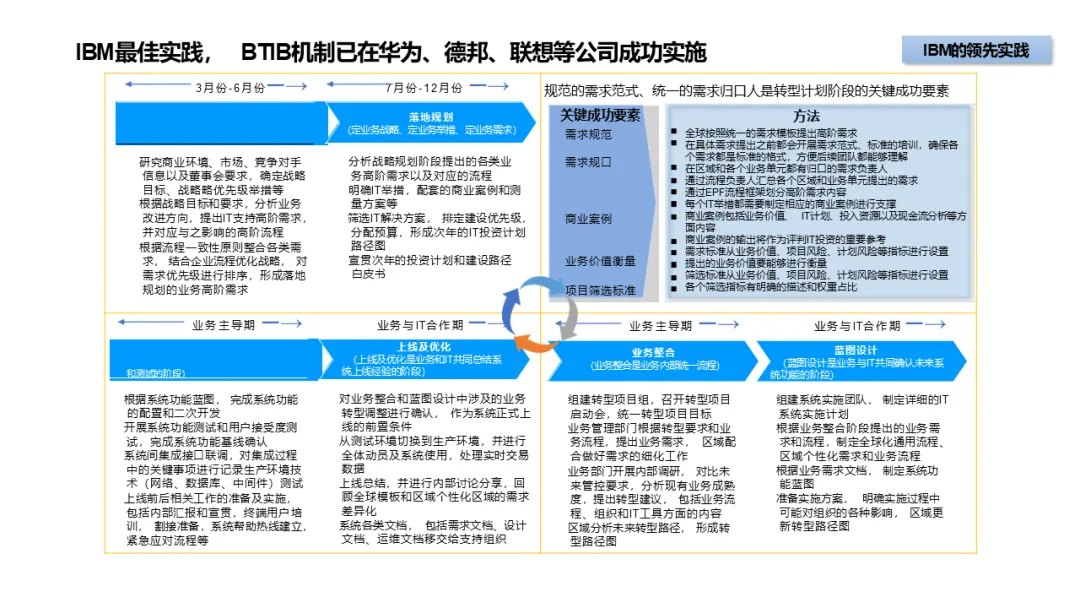 BTIT (Business Technology Integration Team):核心是搭建业务与IT之间的桥梁。通过建立新型的组织、流程与考核机制,确保IT能精准、高效地响应并引领业务需求,从“被动接单”转向“主动规划”。