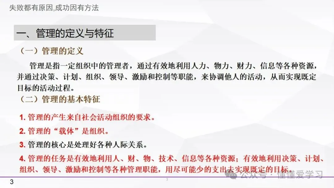 • 目的性:管理的根本任务是有效利用资源和职能,实现组织目标。这是管理的最终目的,也是衡量管理效果的重要标准。