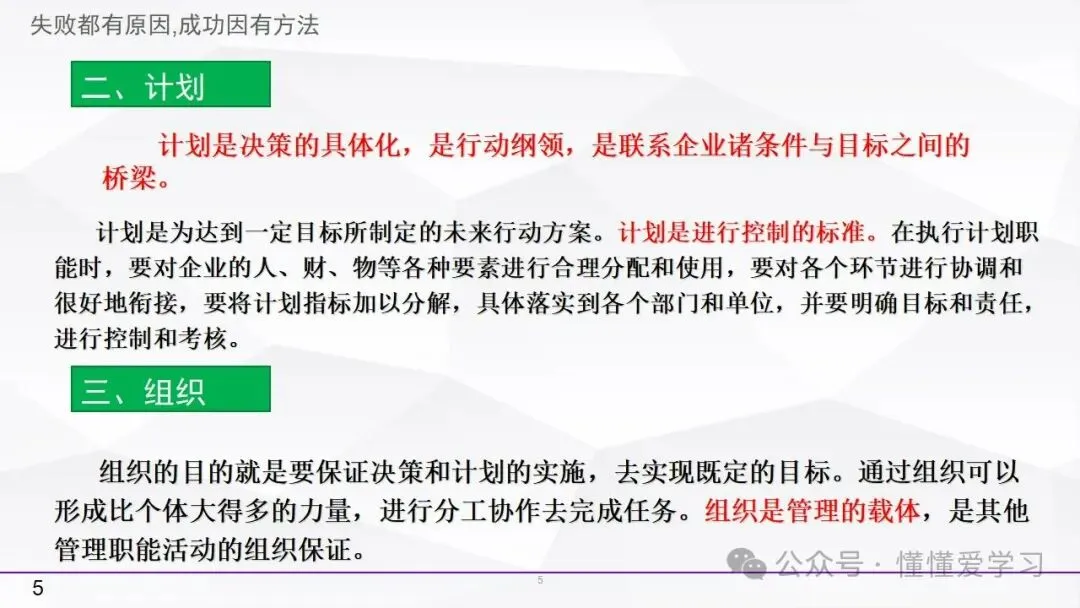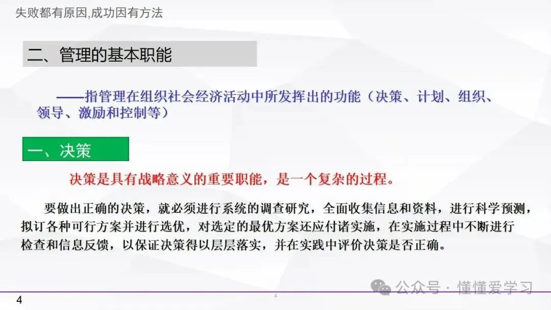 • 决策:决策是管理过程中具有战略意义的复杂过程。它涉及对多个可行方案的分析、比较和选择,以确保所选方案的可行性和优化性。有效的决策需要系统的研究和信息收集,以确保决策的科学性和合理性。