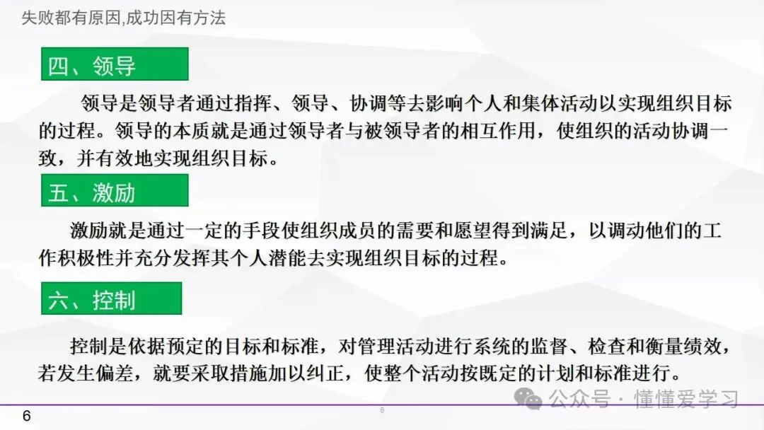 • 领导:领导职能涉及对个体和集体活动的指导和影响,以确保组织目标的顺利实现。领导者通过激励、沟通和指导,激发团队成员的积极性和创造力,推动他们朝着共同的目标努力。领导职能对于组织的凝聚力和执行力具有重要影响。