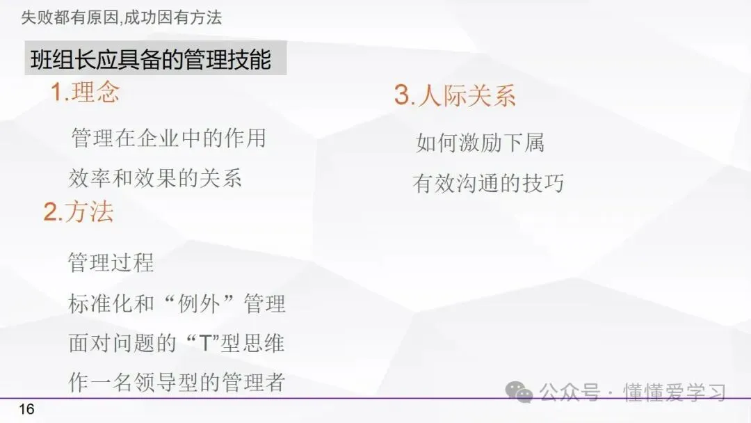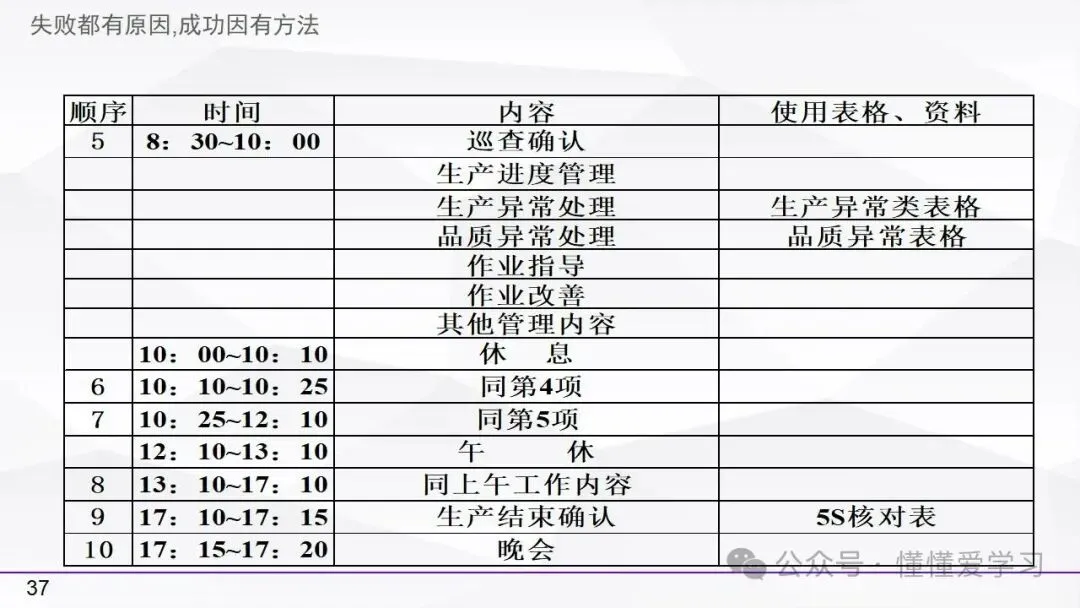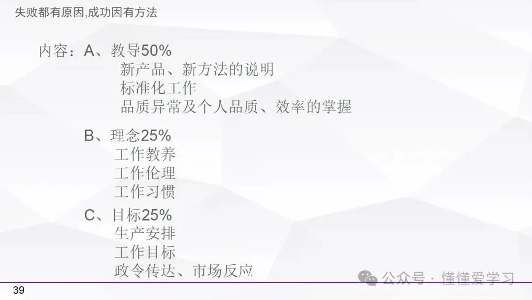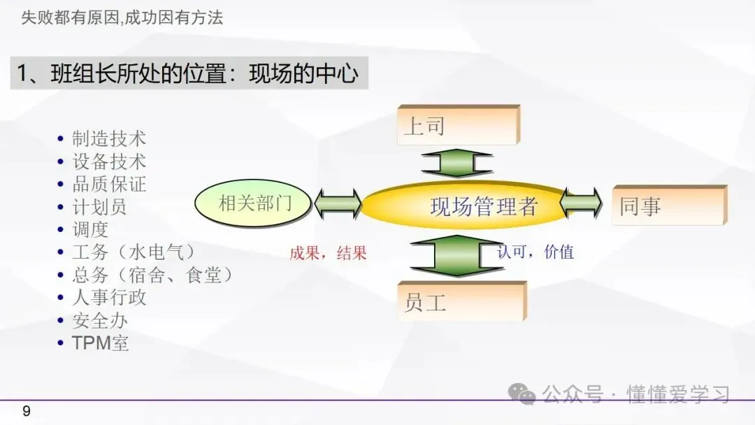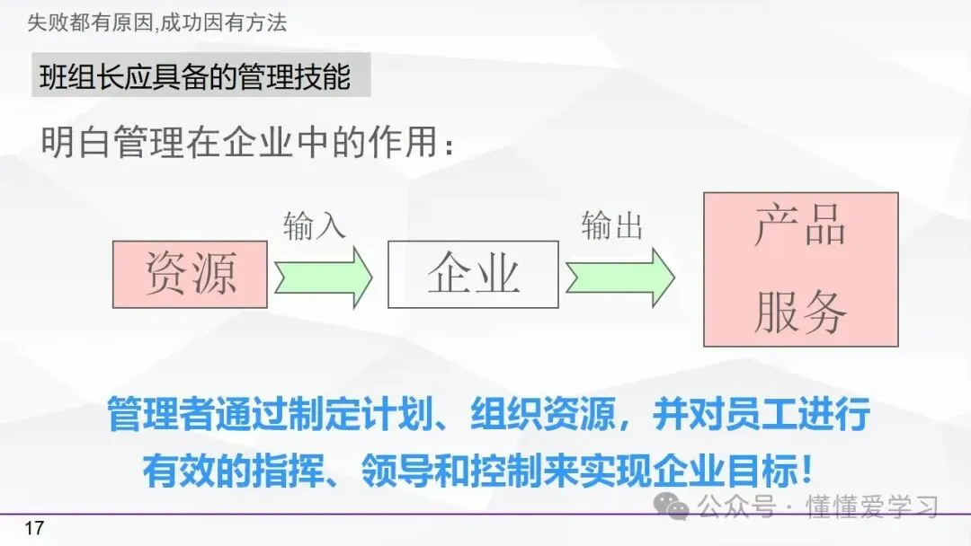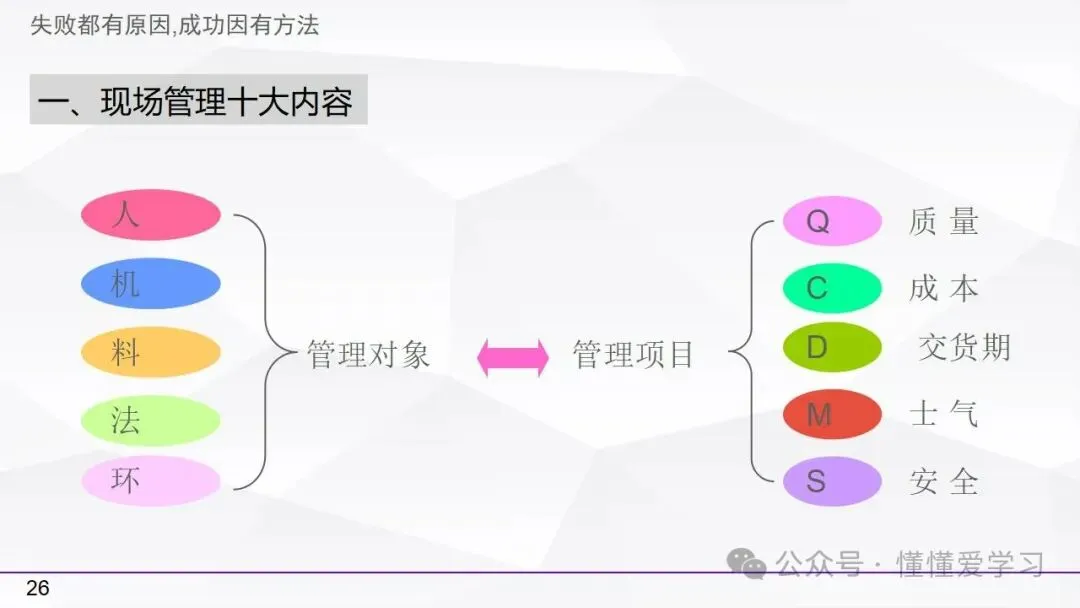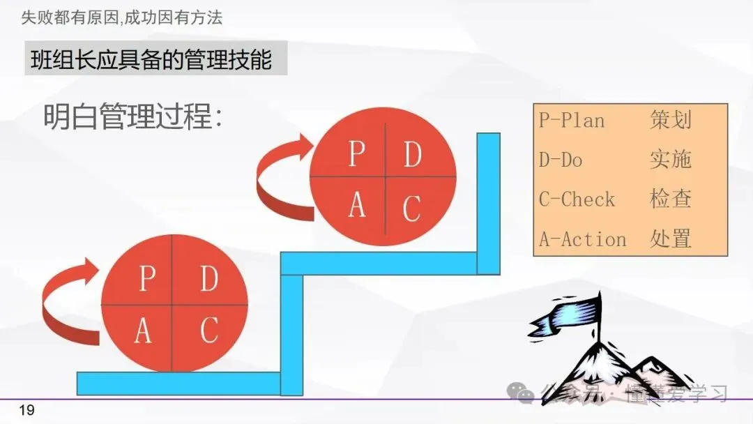 • 方法:熟悉并掌握管理过程(如PDCA循环),运用标准化和例外管理等工具来优化工作流程和提高生产效率。
