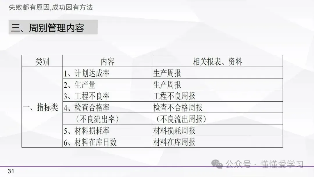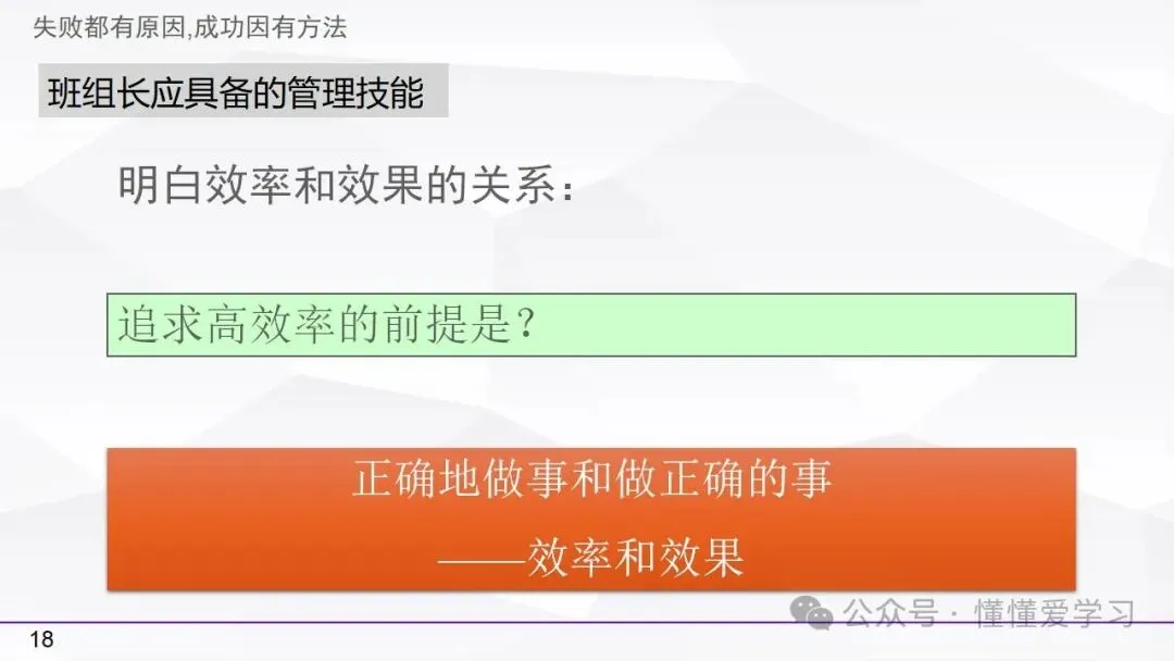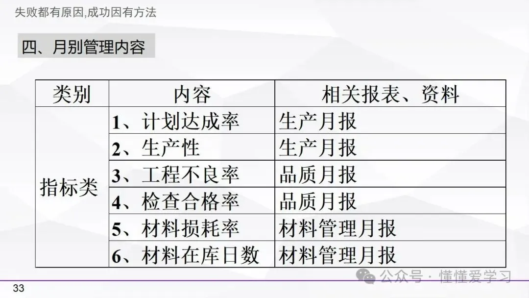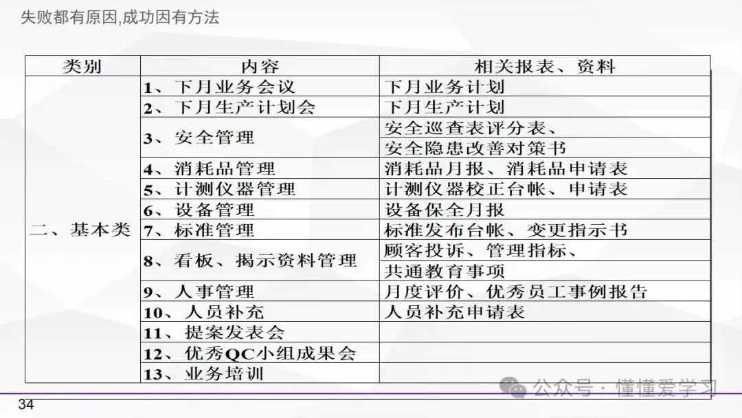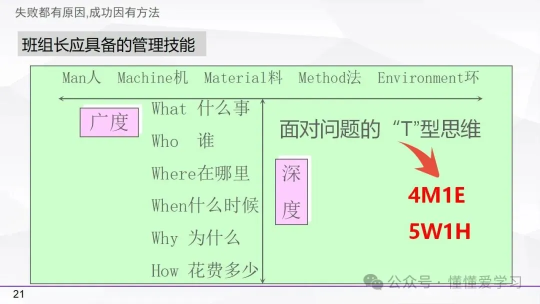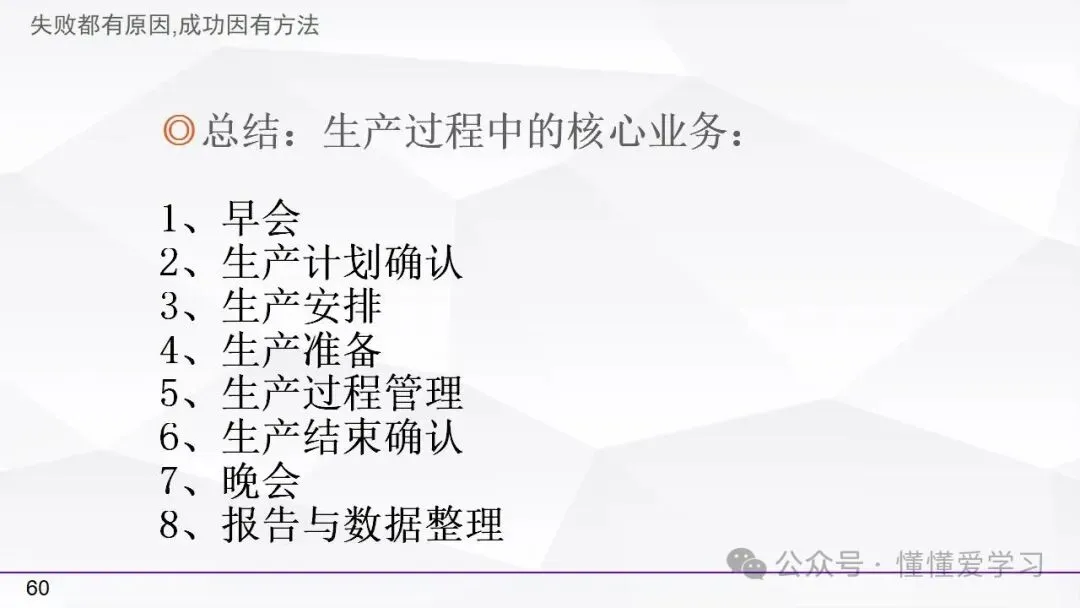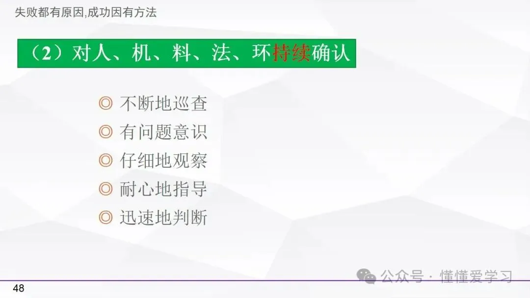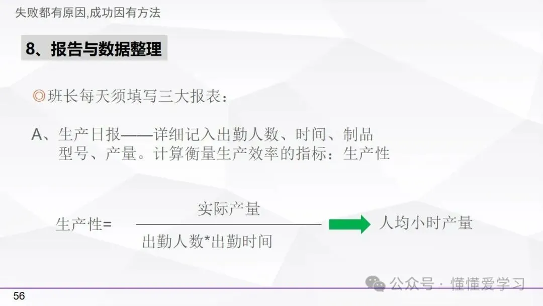 • 方法:熟悉并掌握管理过程(如PDCA循环),运用标准化和例外管理等工具来优化工作流程和提高生产效率。