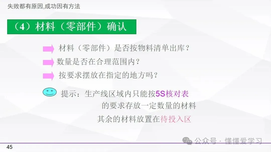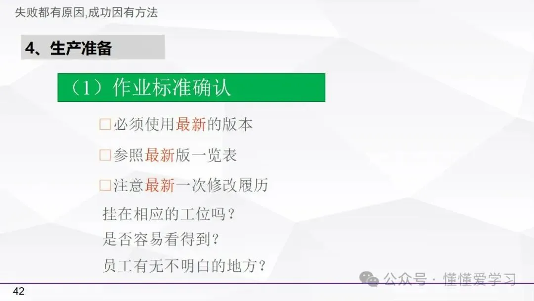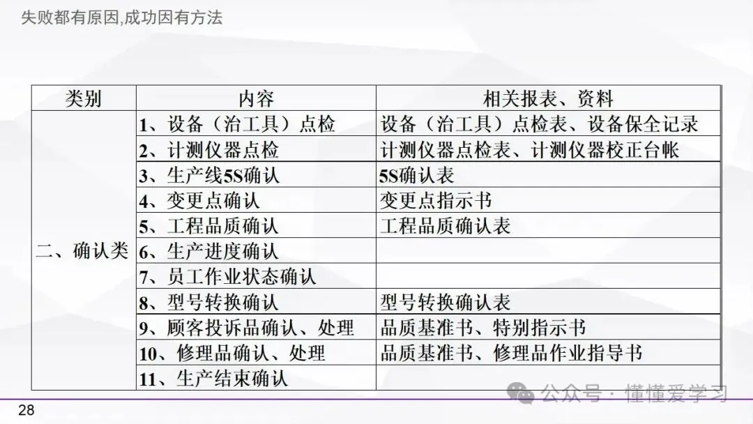 • 生产准备:检查作业标准、5S状况、设备点检、材料确认以及变更事项,确保生产前的各项准备工作充分到位。